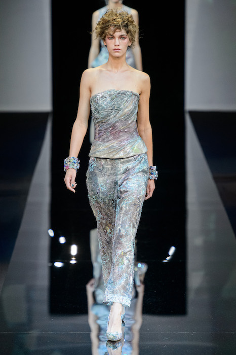 Мы изо всех сил сдерживались, чтобы не поставить банальный заголовок «Море волнуется раз», который любят в глянцевых изданиях, потому что у Giorgio Armani случилось именно оно. Костюмы, платья, комбинезоны, даже серьги и сумки напоминают о море: переливами ткани, похожей на морскую пену текстурой, декором как будто бы из прибрежных камней и, конечно, палитрой.