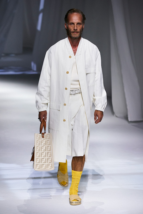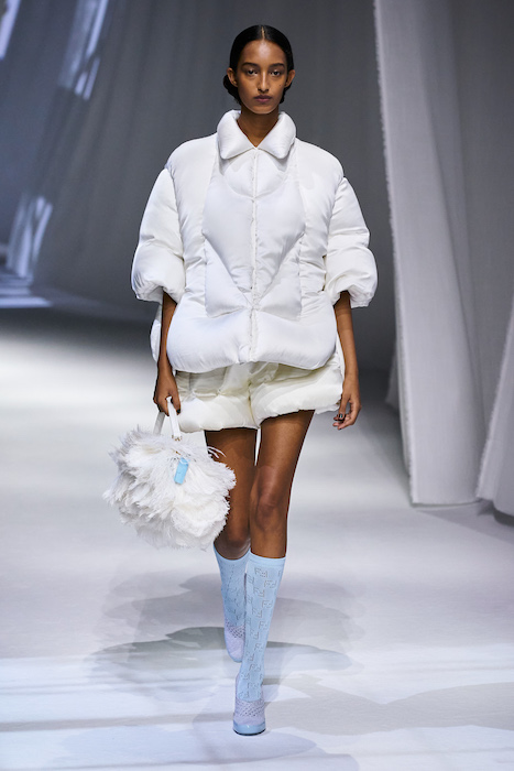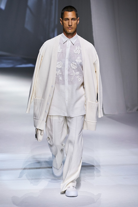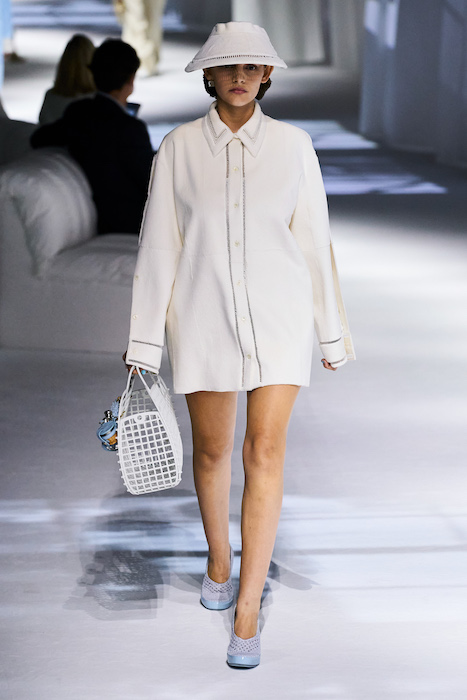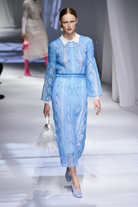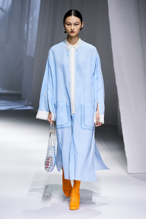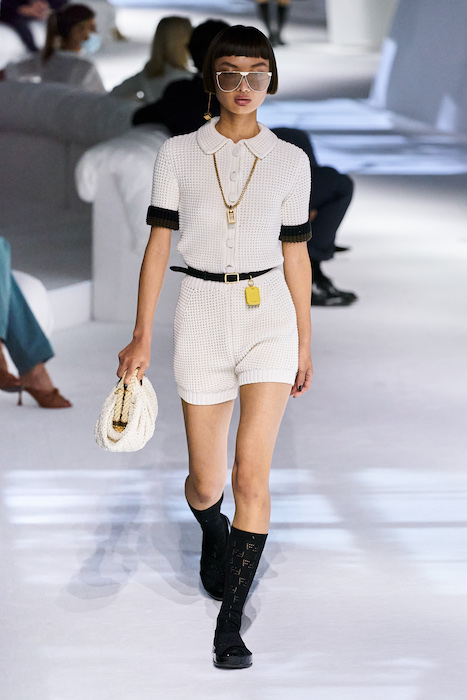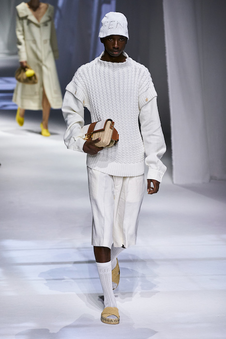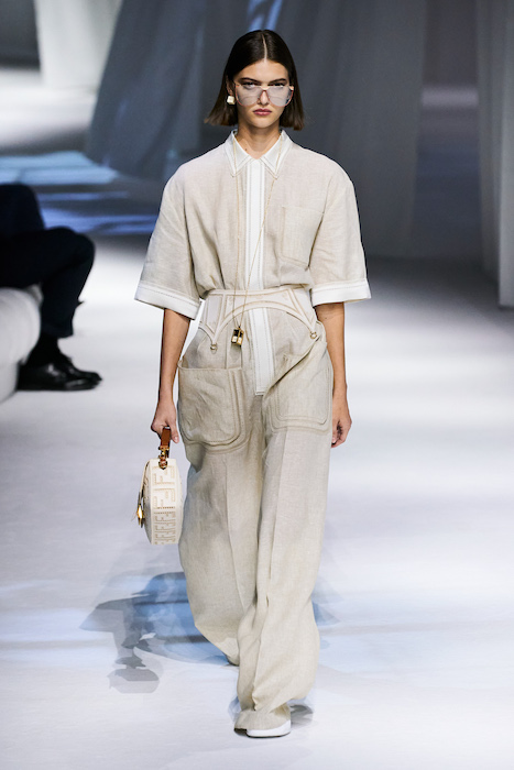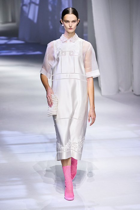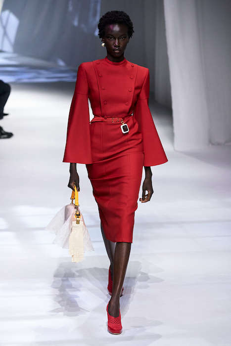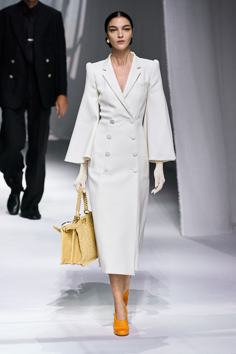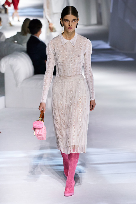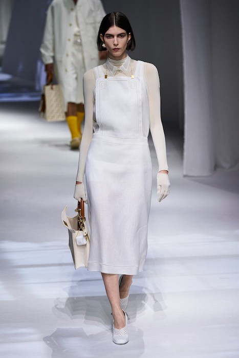 Fendi одним из первых на Неделе моды в Милане провел офлайн-показ с гостями. Белоснежное пространство, мягкие диваны, социальная дистанция между гостями — как рапортует из Милана наш главный редактор Катя Дарма, возникало ощущение больничной стерильности, при этом нисколько не отталкивающей. Сама коллекция Сильвии Вентурини Фенди была такой же чистой: плавные линии шелковых платьев, нежные костюмы с брюками чуть ниже колена, уютный, но при этом не расхлябанный трикотаж, воротники жакетов, которые напоминают о моде 1950-х, — чувственные, но строгие. Продуманная минималистичность вещей заставляет вспомнить предсказания о том, что после пандемии дизайнеры не будут ничего усложнять — нам и так хватает трудностей. В коллекции только один яркий цвет — бесскомпромиссный красный. Палитра остальных вещей включает белый, молочный, оттенки коричневого и нежно-голубой, напоминающий о форме медицинских работников.