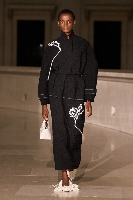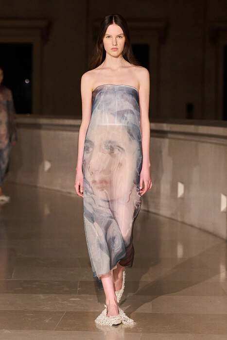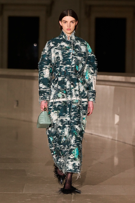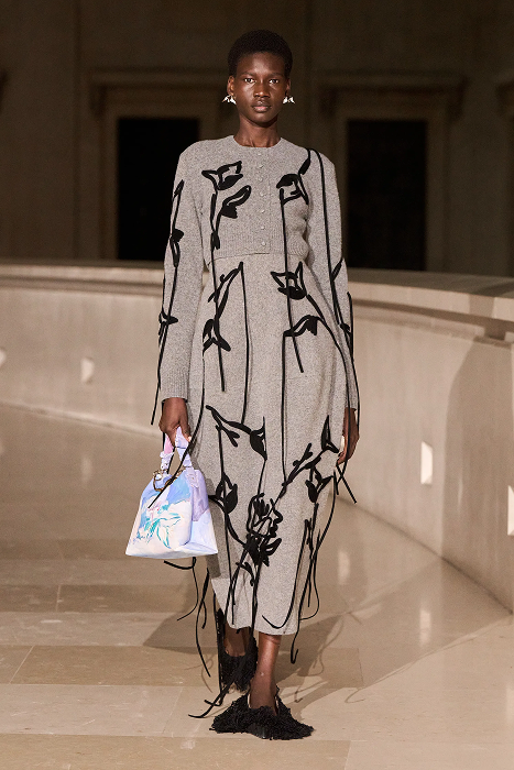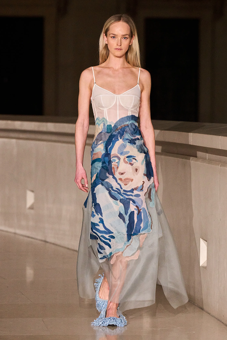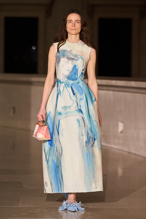 Портреты Доначи команда дизайнера переносила на платья с широкими юбками, укороченные топы из органзы и неопреновые пальто с покатыми плечами по-особенному — увеличив до почти абстрактного масштаба. «Мы вручную окрасили 50 разных оттенков органзы», — комментировал Эрдем. Здесь же появились цветы (излюбленный мотив дизайнера), а следом — подметающие пол туфли и сумки-фавориты прошлого сезона Bloom, собранные из бахромы узкие юбки, жатые и кожаные платья, комплекты будто из 50-х с размытыми принтами и украшенные крупными, будто нанесенными широкой кистью мазками.
