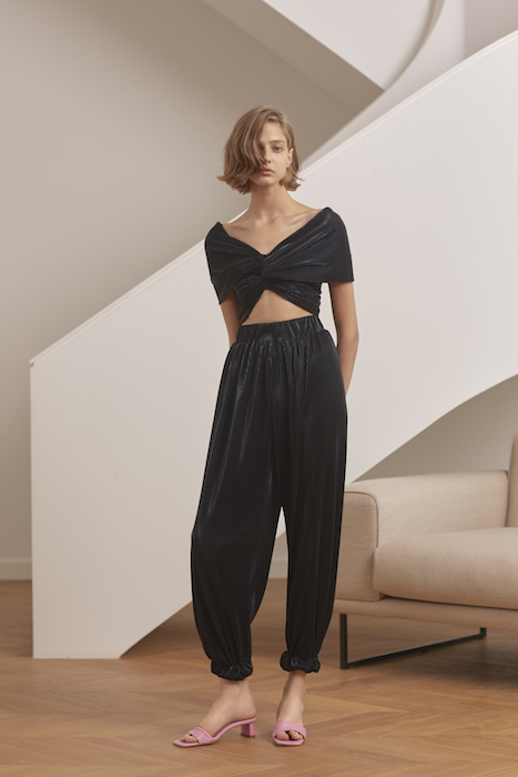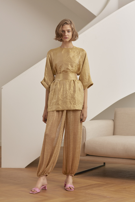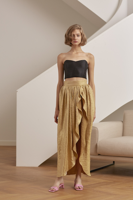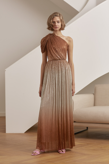 В новой коллекции Юлии Калманович очевидно обращение к древнегреческому костюму. Топы сделаны по подобию хитона, только из переливающейся ткани и с крошечными оборками по краю. Мерцающие платья с градиентной расцветкой напоминают пеплосы: выдают характерные драпировки. Задрапировано в новой коллекции вообще почти все, включая позолоченные мини-юбки и короткие шифоновые топы.