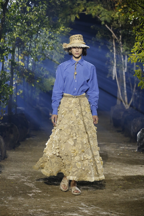 Но новую коллекцию Мария Грация Кьюри все же посвятила сестре Кристиана Диора Катрин, которая тоже любила работать в саду и разбиралась в цветах. Дизайнер консультировалась с Эммануэлем Кочча, автором книги «The Life of Plants: A Metaphysics of Mixture», а также изучала архивы парижского музея естественной истории. Отсюда на прозрачных платьях, костюмах с шортами и сарафанах вышивка и принты с растительными мотивами. Кроме них, в коллекции есть вареный деним, вещи с градиентом, жакеты в «гусиную лапку» и платья, будто сделанные из соломы.