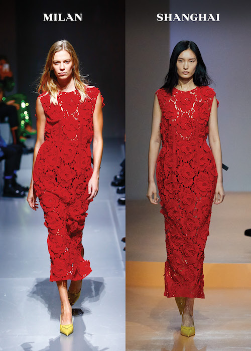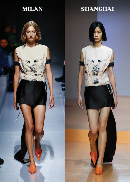 В этом сезоне шоу Prada проходило одновременно в Милане и Шанхае — трансляцию вели сразу с двух площадок. Миучча Прада и Раф Симонс показали уже третью совместную женскую коллекцию. Центральной вещью стала атласная мини-юбка с длинным «хвостом», развевающимся при ходьбе. На шоу вещь носили со свитерами, акцентирующими грудь, топами без рукавов и кардиганами на шнуровке вместо пуговиц. Были платья, расстегнутые и распахнутые на спине, а также брутальные куртки и плащи из искусственно потертой кожи, которые выглядели как винтажные. Хитами в линейке аксессуаров и обуви должны стать кожаные браслеты на плечо и яркие остроносые туфли на танкетке.