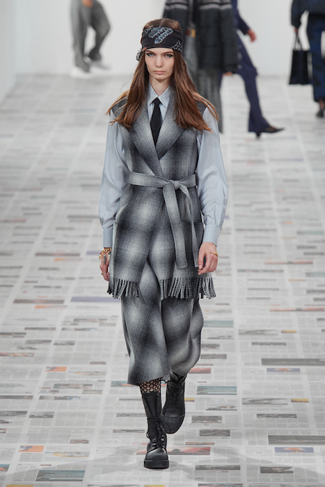 В Париже завершился показ Dior. На этот раз шоу проходило в саду Тюильри — модный дом финансирует проект по его восстановлению. Пространство для показа украсили неоновыми надписями с феминистским посылом: «Patriarchy = Climate Emergency», «Women’s Love is Unpaid Labour», «Consent», «Feminine beauty is ready-made». Сама коллекция открылась образом с костюмом и галстуком. Большинство вещей напоминало о моде 1970-х: были джинсовые комплекты с жилетками, костюмы из вельвета, вещи с бахромой, богемные платья в пол. Пальто, накидки, шерстяные анораки и длинные жилеты напоминали пледы — благодаря клетке и бахроме на подоле. Почти все модели выходили на подиум либо в кожаных панамах, либо в шелковых платках, завязанных на манер банданы. В обувной линейке любопытными получились сапоги овчиной наружу, прорезиненные челси и ботинки на липучках.