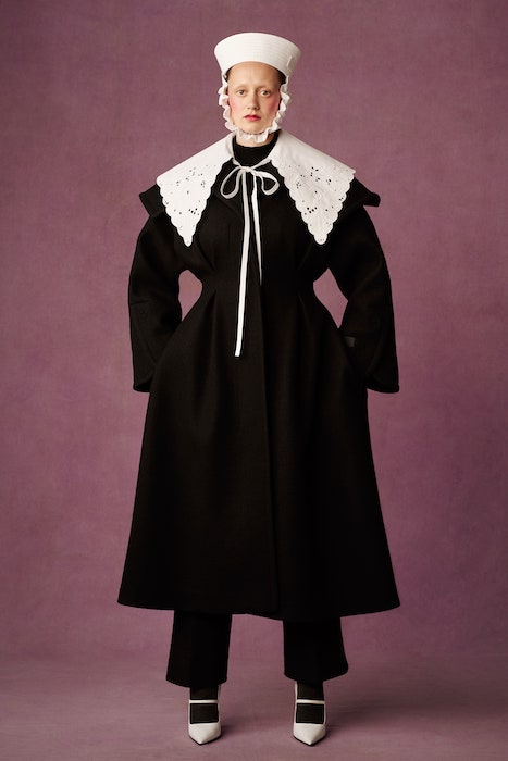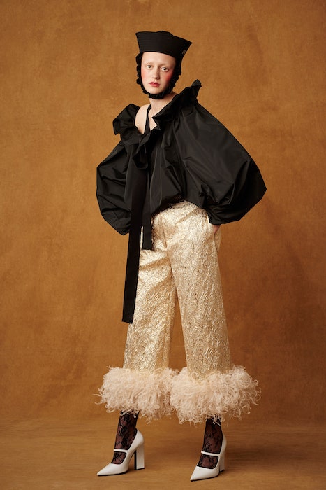 Новая коллекция Гийома Анри для возрожденного бренда Patou пронизана французскими кодами. Огромные фетровые шляпы отсылают к старому парижскому рынку «Ле Аль» (Les Halles), которому посвящен роман «Чрево Парижа» Эмиля Золя, — раньше грузчики носили похожие шляпы, но с металлическим основанием, чтобы удерживать на голове ящики с овощами и фруктами. Большие съемные воротники напоминают о Провансе — материал специально выбран так, чтобы аксессуар можно было бы стирать в машинке. Деревянные подвески и пуговицы на уютном дафлкоте — не что иное, как свирели, которые использовали в сельской местности. За парижскую утонченность в коллекции отвечают платья из золотой парчи, брюки с перьями, архитектурные костюмы с мини-юбками и объемное розовое пальто с гипертрофированным воротником.