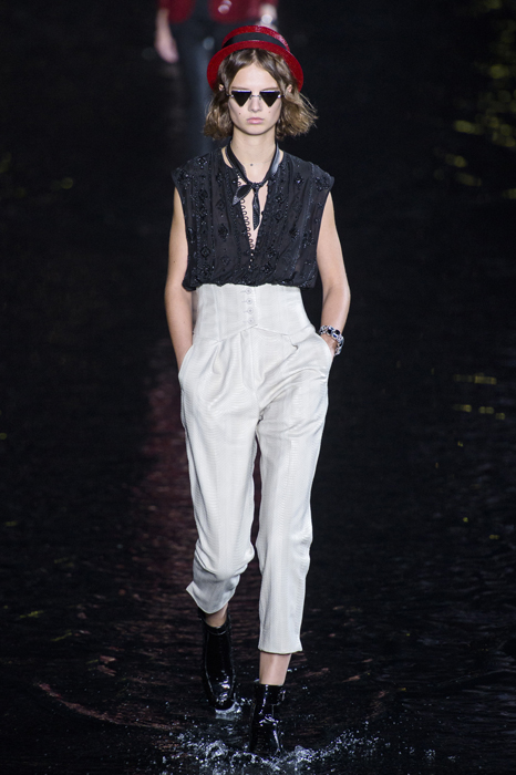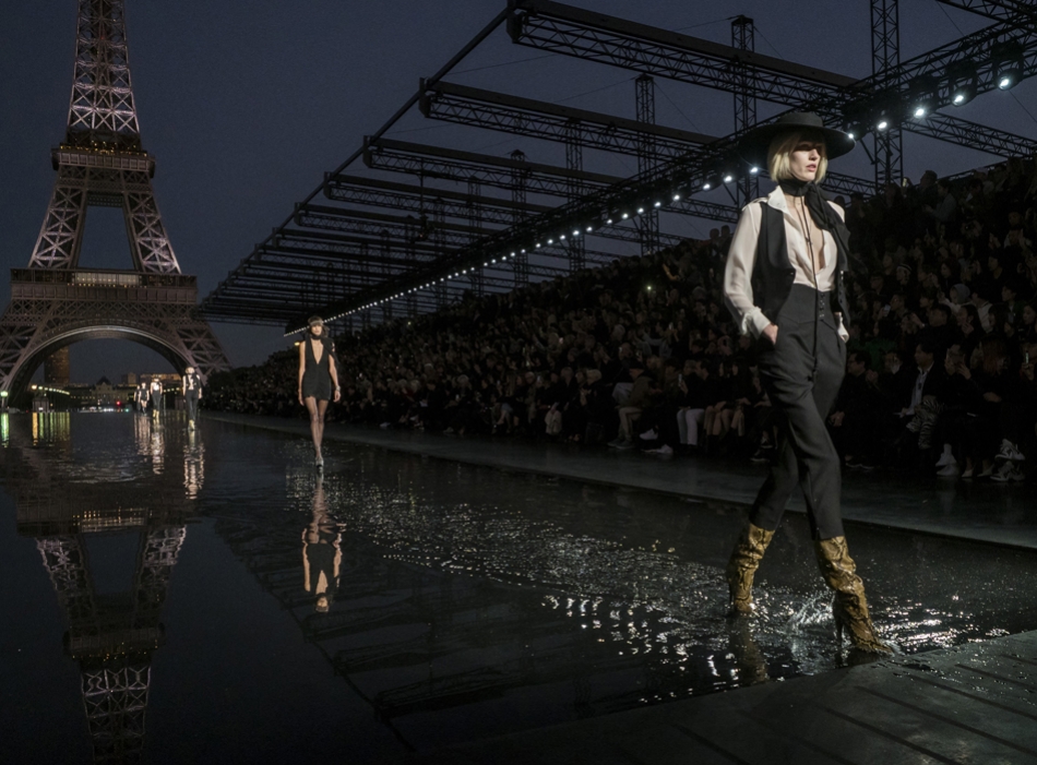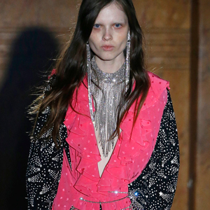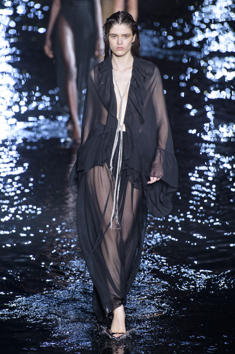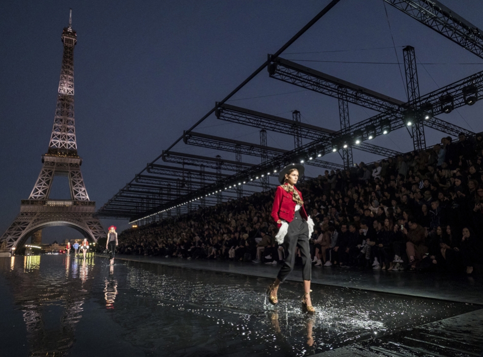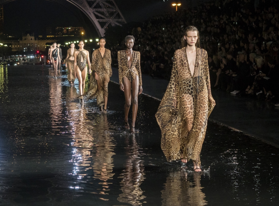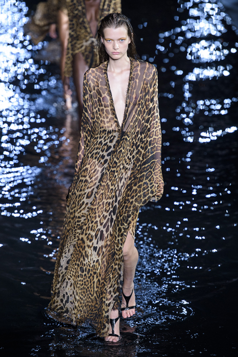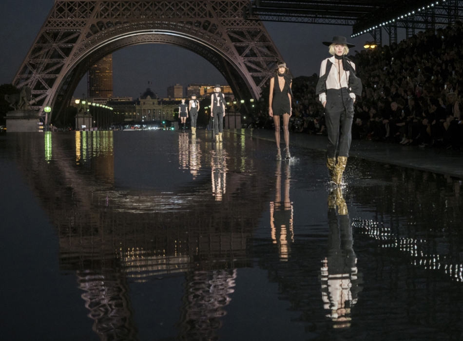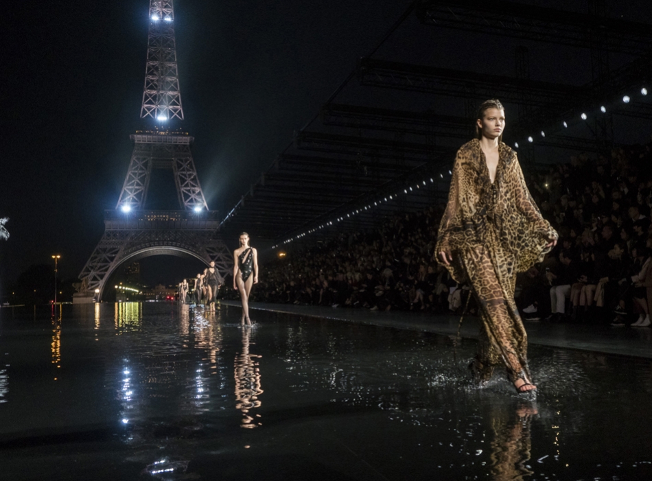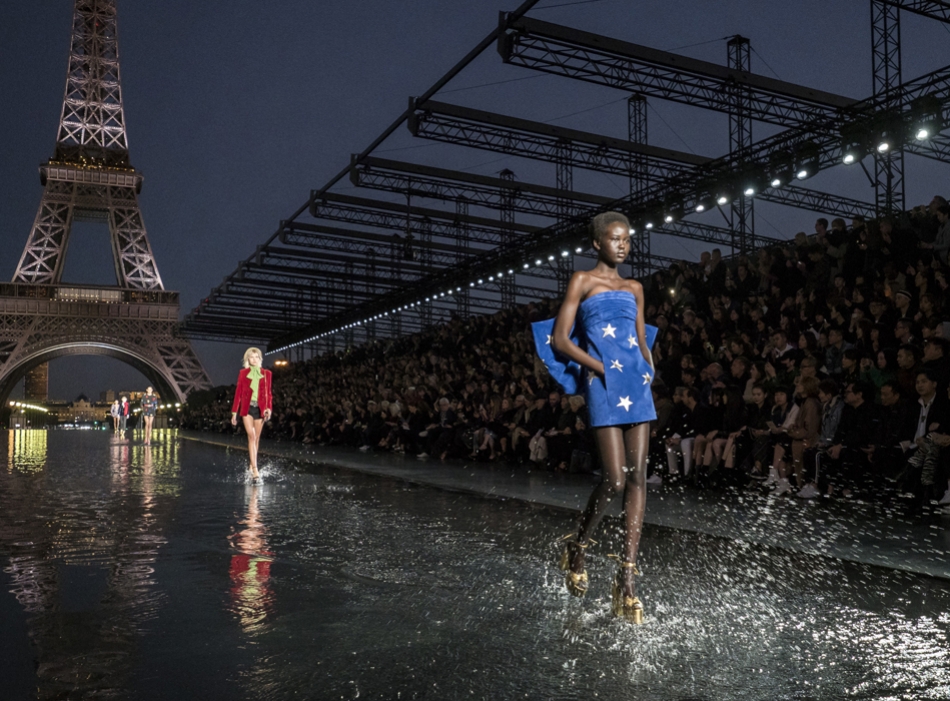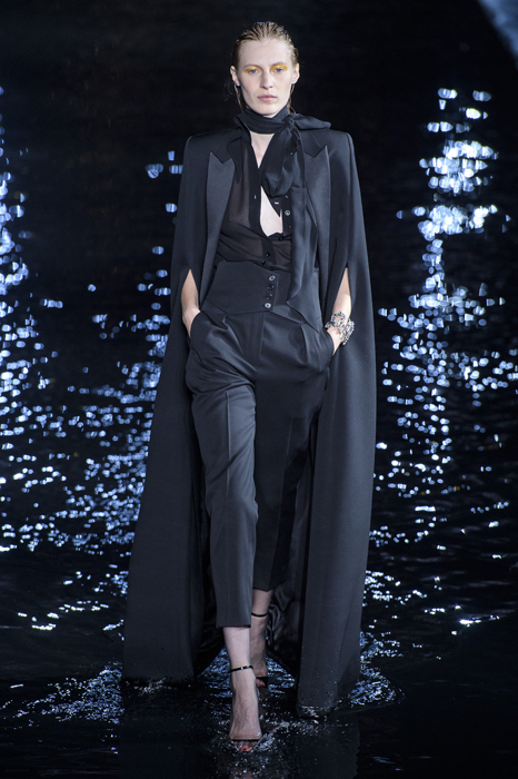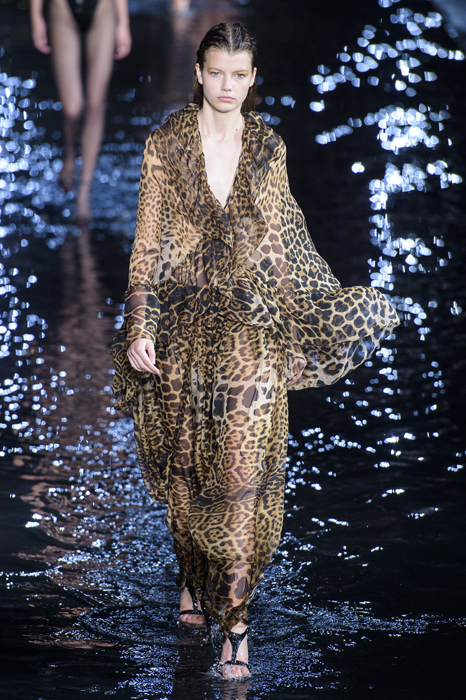 Биографы Ива Сен-Лорана помнят, когда в мастерскую кутюрье зашла Палома Пикассо — дочь художника и дизайнер ювелирных украшений. Сен-Лоран оглядел ее купленное на барахолке платье с широкими плечами, тюрбан с перьями — и окрестил своей музой. Затем в коллекции «Скандал» 1971 года появляются яркие шубы и наряды с перьями, какие носила Палома. Ее стиль повлиял и на Энтони Ваккарелло: частица Yves в названии бренда до сих пор не появилась, но дизайнер не перестает копаться в архивах бренда. Кроме цитат стиля Паломы в коллекции считывается влияние Марракеша (полупрозрачные кафтаны и леопардовые купальники). Отдельно хочется отметить кинематографичность показа — модели, в числе которых была Симона Куст, дочь художника Александра Петлюры, ходили на фоне Эйфелевой башни и пальм (и снова отсылка к Северной Африке).