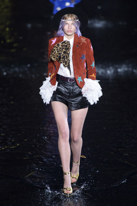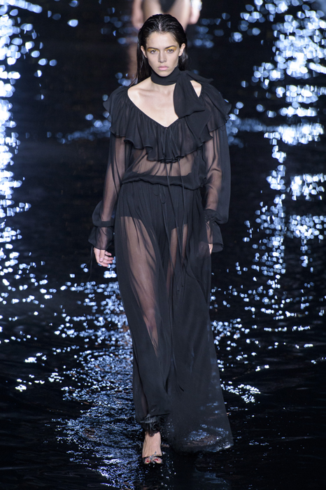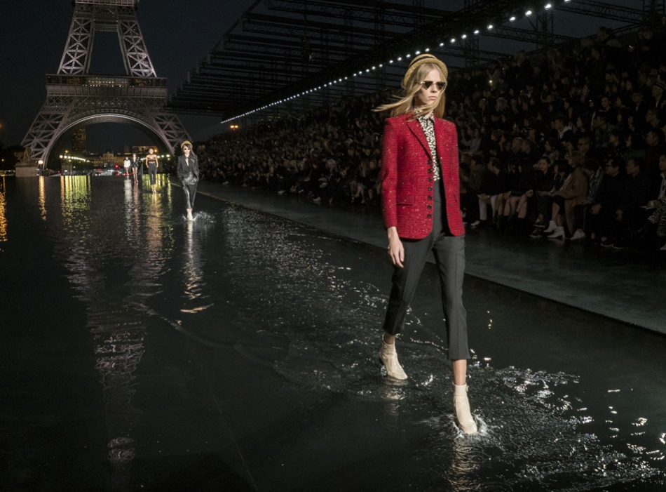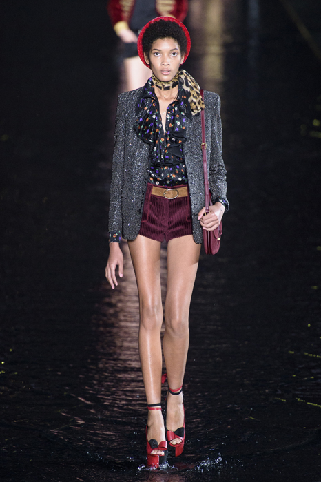 Биографы Ива Сен-Лорана помнят, когда в мастерскую кутюрье зашла Палома Пикассо — дочь художника и дизайнер ювелирных украшений. Сен-Лоран оглядел ее купленное на барахолке платье с широкими плечами, тюрбан с перьями — и окрестил своей музой. Затем в коллекции «Скандал» 1971 года появляются яркие шубы и наряды с перьями, какие носила Палома. Ее стиль повлиял и на Энтони Ваккарелло: частица Yves в названии бренда до сих пор не появилась, но дизайнер не перестает копаться в архивах бренда. Кроме цитат стиля Паломы в коллекции считывается влияние Марракеша (полупрозрачные кафтаны и леопардовые купальники). Отдельно хочется отметить кинематографичность показа — модели, в числе которых была Симона Куст, дочь художника Александра Петлюры, ходили на фоне Эйфелевой башни и пальм (и снова отсылка к Северной Африке).