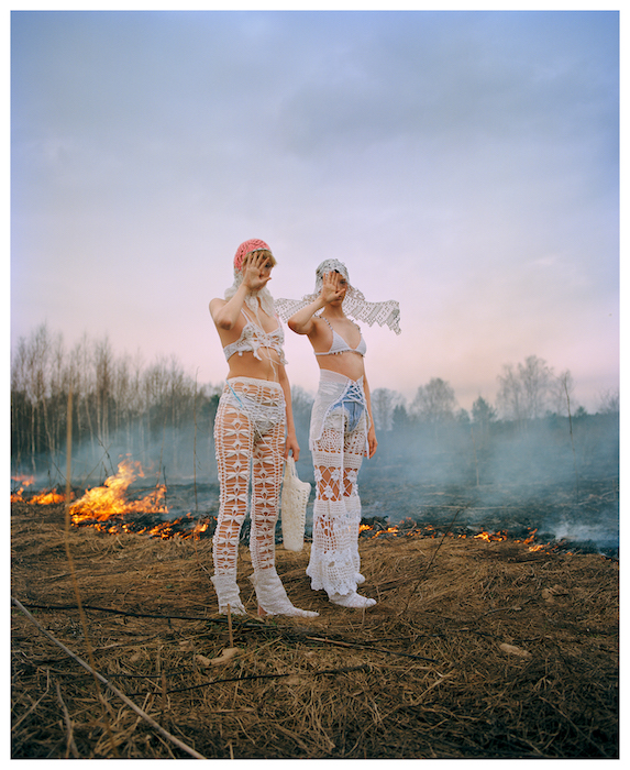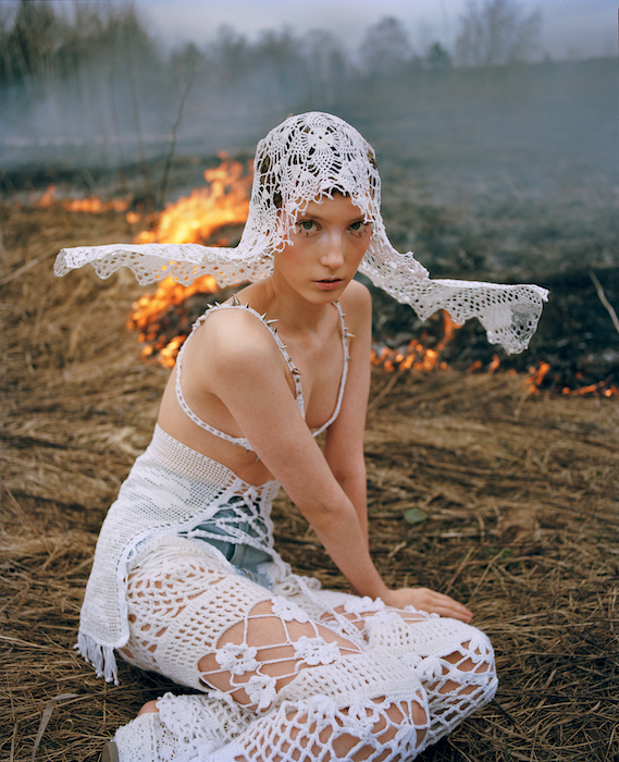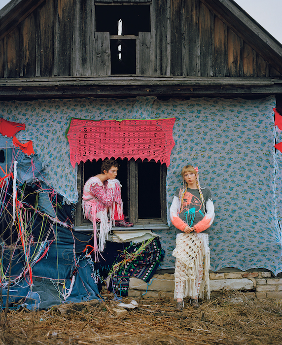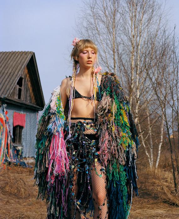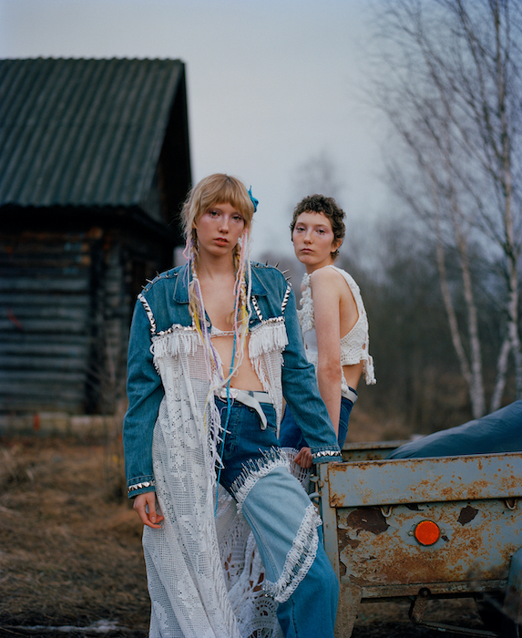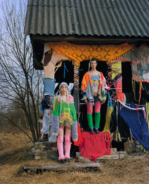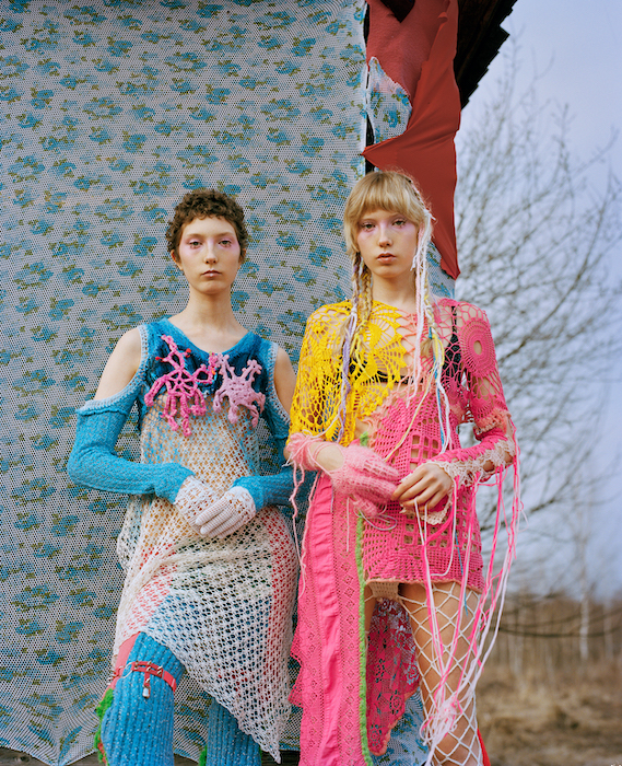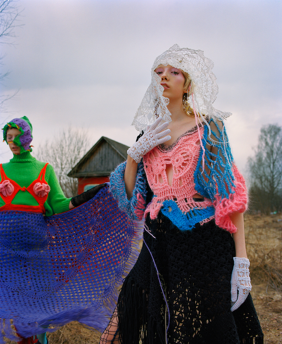 Все вещи Vereja связаны вручную крючком и спицами. Многое сделано из переработанных материалов — денима, свитеров и скатертей, собранных в секонд-хендах. Почти всю коллекцию Игорь создал сам, два месяца орудуя крючком и спицами. С несколькими свитерами дизайнеру помогала мама. Вещи украшают персонажи сказочной вселенной: есть платье-сова, а на лосинах — узор из стрекоз. В лукбуке также задействованы вязаные сапоги и кружевные салфетки: первые должны напомнить о моде середины нулевых в провинциальной России, вторые — об интерьерах в российских деревнях.