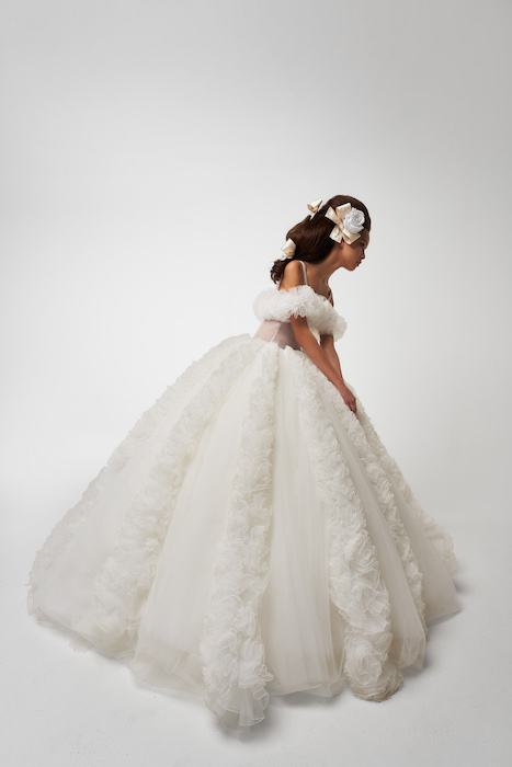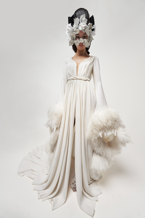 Фильм о новой коллекции Джамбаттисты Валли снят на белом фоне — вещи из нее настолько самодостаточны, что не требуют дополнительных украшательств. Сотни метров тафты ушли на многоярусные и многослойные платья — выглядит так, будто они сделаны из сахарной ваты. Подобия греческих накидок расшиты страусиными перьями, топы украшены объемными розами из тюля, вышитыми камнями цветками и аппликациями из листьев, на которых проработана каждая жилка. Объемные прически с лентами для съемки лукбука вдохновлены снимками первой итальянской топ-модели Бенедетты Барзини и американской актрисы и модели Марисы Беренсон 1960-х годов.