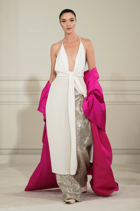 Новая кутюрная коллекция Valentino называется Anatomy Of Couture. Креативный директор Пьерпаоло Пиччоли хотел исследовать именно форму и силуэт, что собственно изначально и было сердцем кутюра. Показ открыла Кристен Макменами в черном мини-платье: грудь подчеркивалась корсетом с фигурным вырезом, а оборки внизу задавали движение. Также в коллекцию вошли лаконичные платья-футболки, пальто-коконы, костюмы, объемные плащи, красиво присборенные на талии блузки, топы со шлейфом — максимальный эффект достигался минимумом выразительных средств, лишь совершенной формой. Впрочем, исследуя силуэты, дизайнер не отказывается и от «зрелищного» кутюра с кристаллами, перьями и каскадом оборок: есть юбки и ботфорты, декорированные одновременно блестками и кружевом, платья и костюмы целиком в кристаллах и объемные театральные кейпы в драпировках. Пиччоли — виртуоз колористики: в этот раз в палитру он включил кобальтовый, салатовый цвета, морозные оттенки голубого, фуксию, фиолетовый и коричневый.