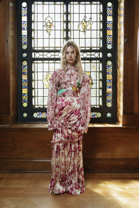 Новую коллекцию дизайнеры марки Джастин Торнтон и Теа Брегацци презентовали в лондонском Зале масонов, посреди огромных антикварных кроватей. Источниками своего вдохновения они называют фильм «Три женщины» 1977 года и разнообразную одежду для сна. Команда Preen работала с атласом, кружевом и шелком в пыльных романтических оттенках розового, желтого и персикового. Словно выцветшие принты напоминают о мебельной обивке. За основу для вечерних платьев взяты сорочки и ночнушки, но их силуэты намеренно сбиваются с помощью драпировок и оборок. Несколько вещей сделаны в лоскутной технике из обрезков ткани от предыдущих коллекций.