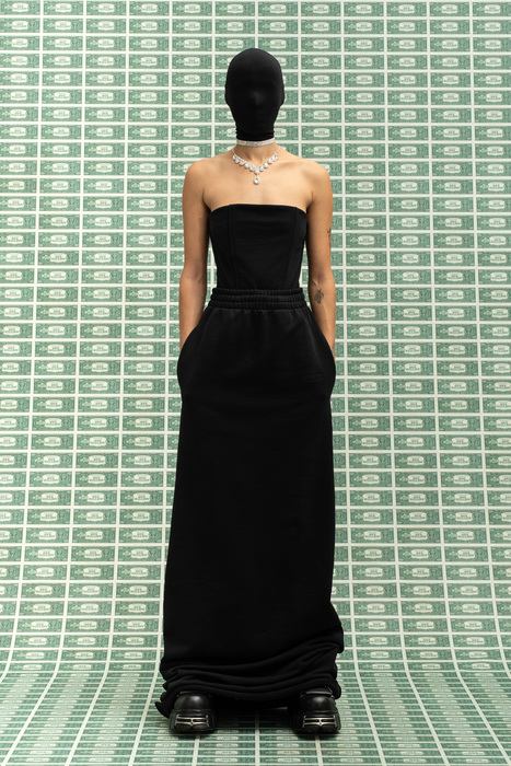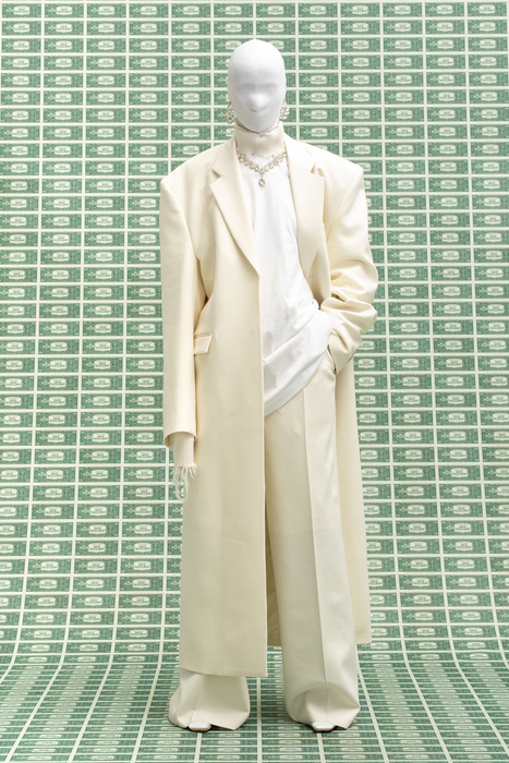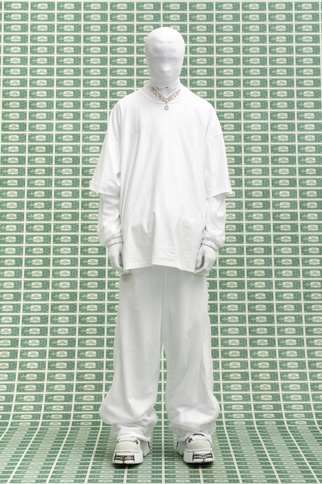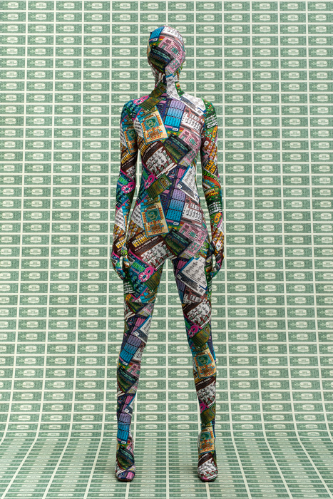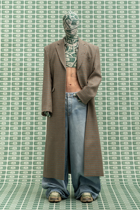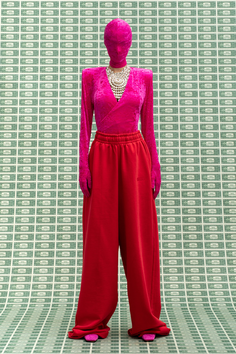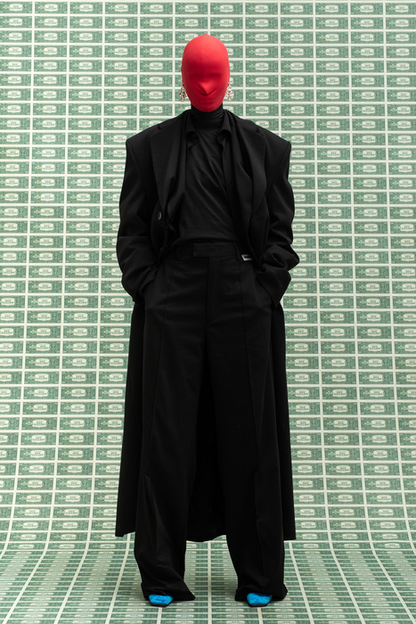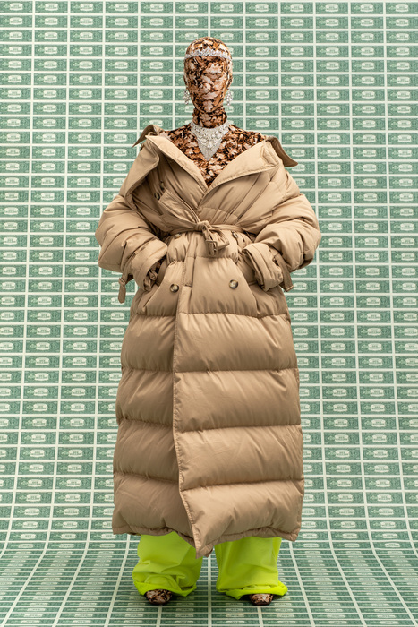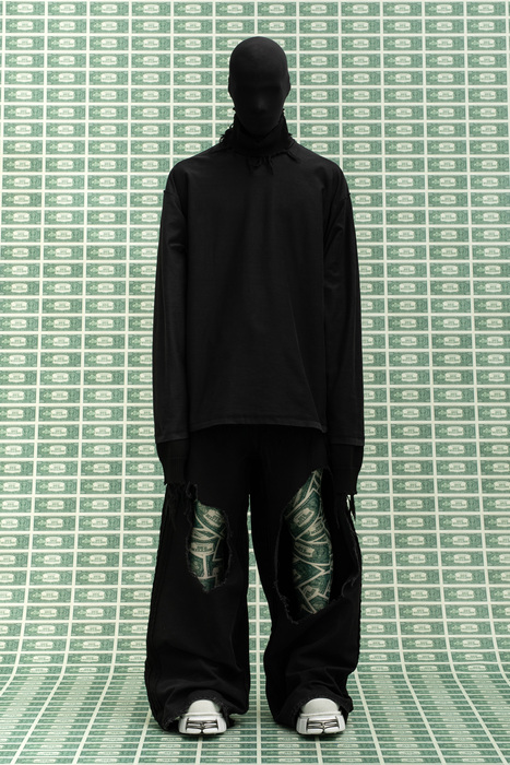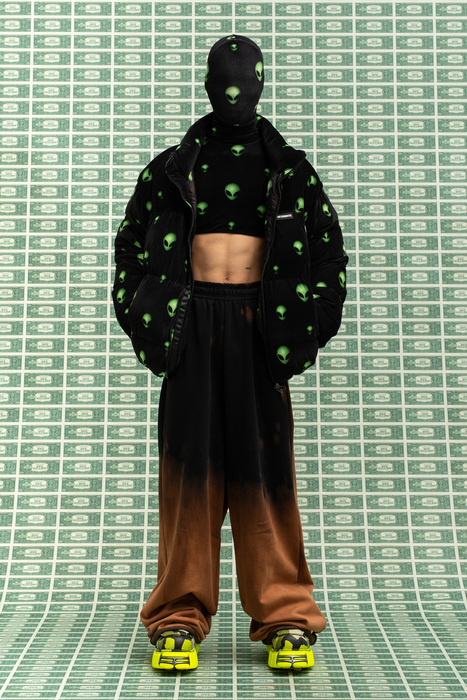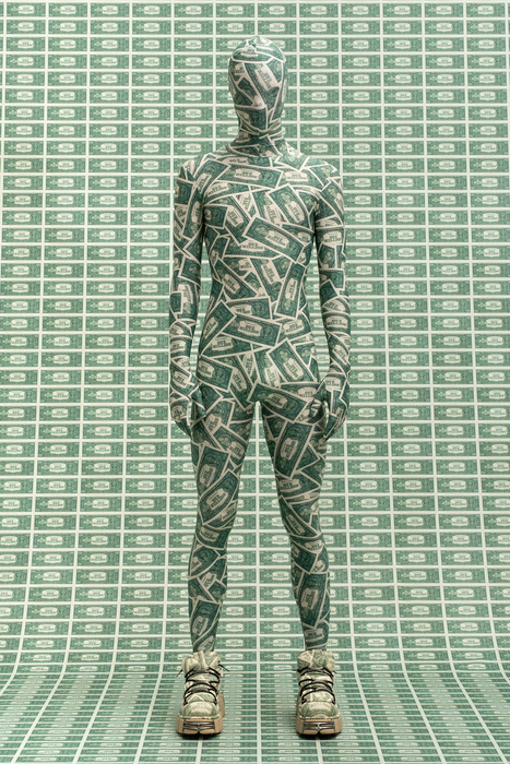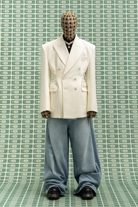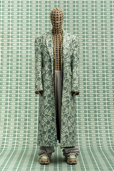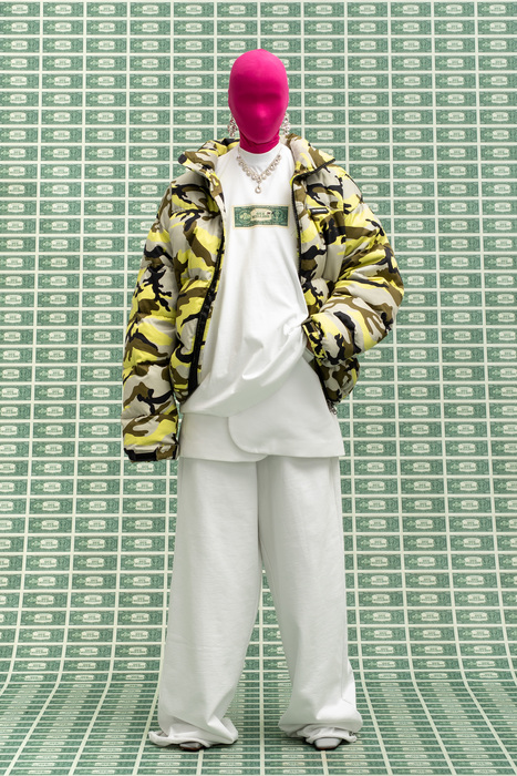Еще одна тема, которую поднимает Гурам Гвасалия в новой коллекции, это одежда для «новых миллионеров»: «Тех, кто инвестировал 1000 долларов в 2010-м и сегодня обладает не менее 80 миллионами долларов; миллионерами из соцсетей, которые достигли славы и богатства просто оставаясь самими собой, а также тех, кто делится своими личными моментами в аккаунтах OnlyFans». Для них разработаны костюмы на основе джерси — материала, из которого обычно шьют футболки и толстовки. В простых вещах на каждый день вроде треников, плащей и джинсовок используются приемы традиционного конструирования, как в кутюрном тейлоринге. А принты платьев, комбинезонов и платьев составлены из долларовых купюр, чипов для майнинга, значка 5G и правил жизни «новых миллионеров»: «I did nothing. I just got lucky».