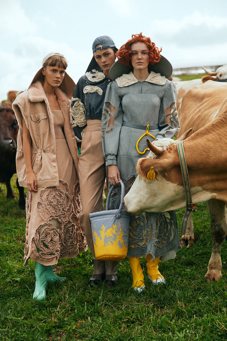 В этом году марка Алены Ахмадуллиной отмечает двадцатилетие. Дизайнер, из сезона в сезон работающая с русскими кодами, в юбилейной коллекции вновь обращается к истокам. На этот раз — к русской деревне. Сезон сбора урожая метафорично показан платьями и куртками с настроченными волнистыми линиями, которые напоминают капусту. Похожие ассоциации вызывают куртки с волнистой стежкой наподобие традиционных фуфаек. Также в коллекции есть связанные крючком платья, флисовые костюмы и пальто с раскраской, как у байковых одеял, дутые косынки и шубы с вышивкой жемчугом. Последние сделаны в сотрудничестве с Saga Furs.