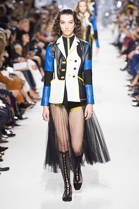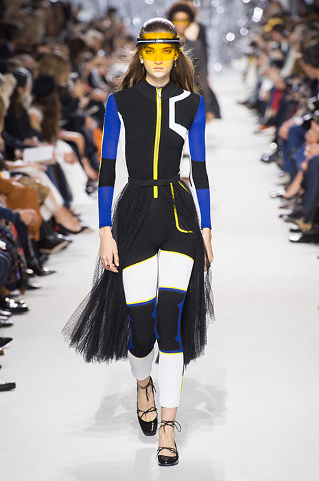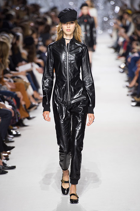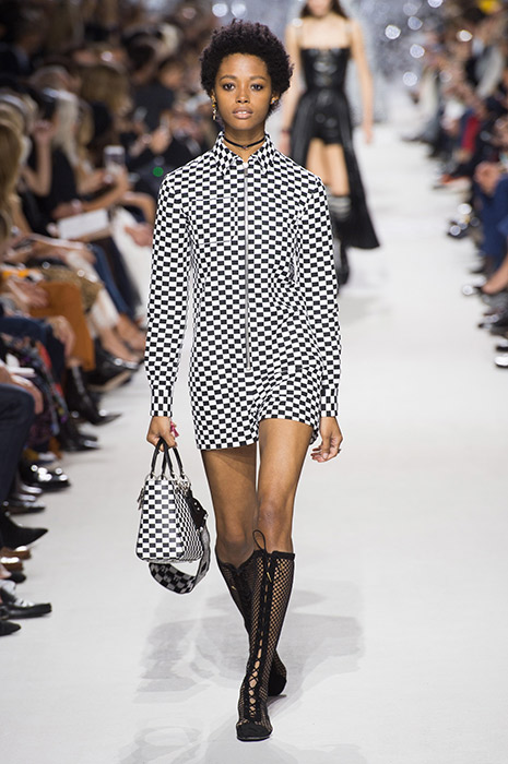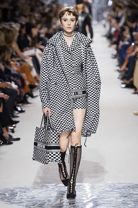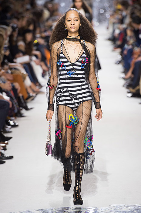 В этом сезоне Мария Грация Кьюри, кажется, решила пойти по пути максимализма и сделала коллекцию из 80 образов, которые собрала из многочисленных субкультурных отсылок: от гонщиков и инди времен The White Stripes до готических лолит. Судя по всему, дизайнер стремилась вернуть 2007 год и взяла за основу стилистику субкультур ска и эмо — по крайней мере, сочетание черного и розового в полосатом принте, черно-белая шашка на комбинезонах и слипонах не может вызывать других ассоциаций у поколения миллениалов.