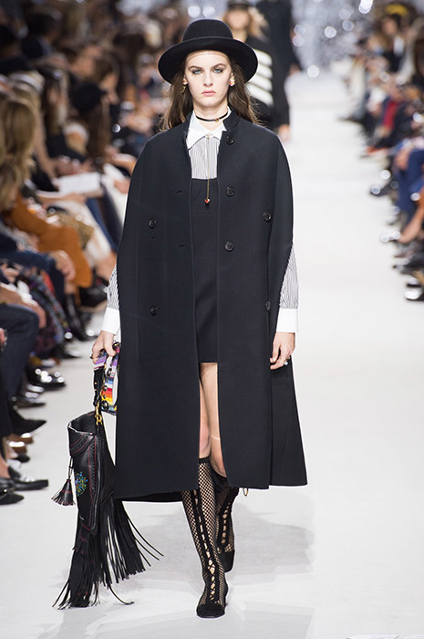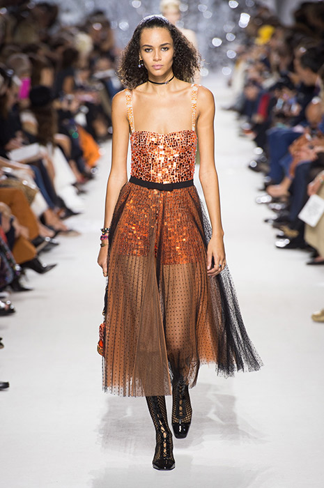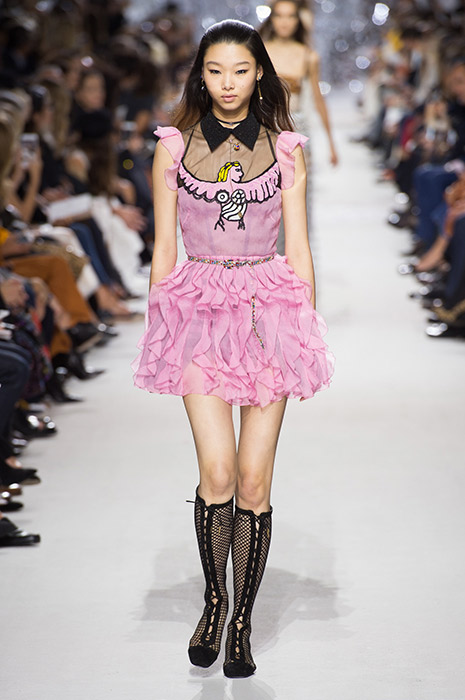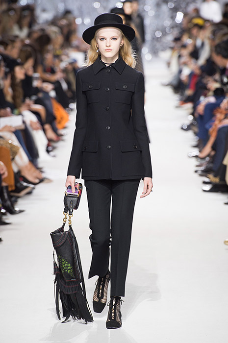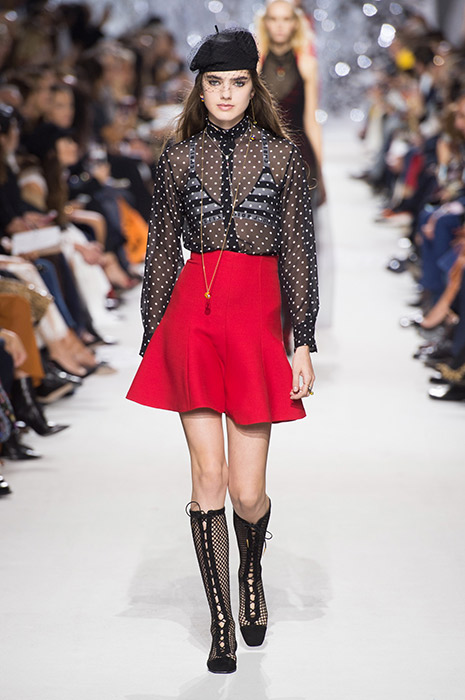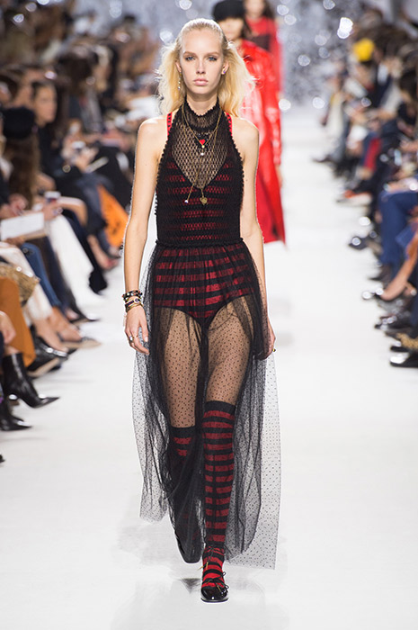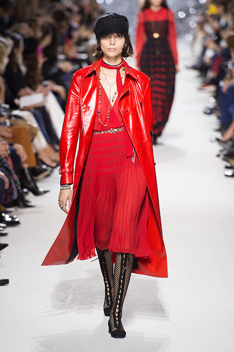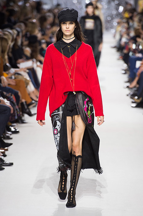 Феминистская тема в коллекции на этот раз приобрела брутальный характер и выразилась в кожаных вещах: плащи и длинные накидки в красных и черных оттенках, комбинезоны и короткие платья дизайнер использовала как символы силы. В то же время в коллекции появились и атрибуты мягкой женственности — платья с лифами, украшенными глиттером, невесомые тюлевые юбки, прозрачные летящие платья, вышивка и фолк-мотивы. Не обошлось и без архивов дома — так, Кьюри отсылает к комбинезонам и маленьким платьям Марка Боана, которые датируются как раз 60-ми, эпохой, когда женщины начали стремительно менять мир.