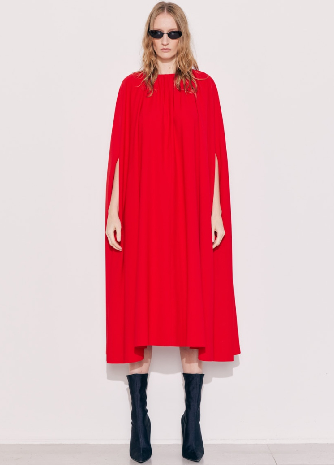 Ярко-красный кейп для тех, кого до сих пор не настиг christmas mood. В нем сразу хочется врубить плейлист новогодних хитов и охладить шампанское.