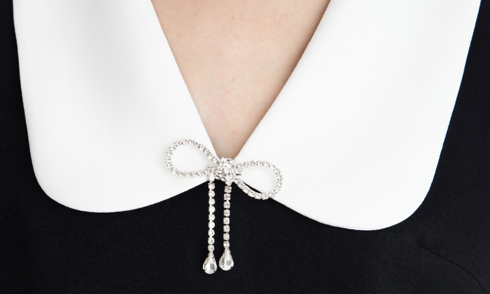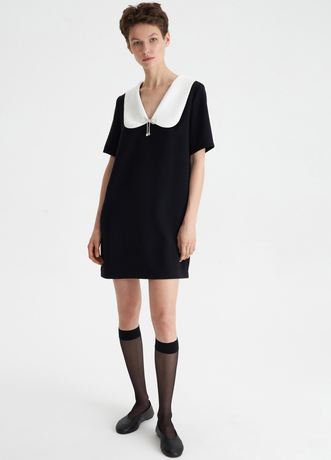 Хорошая иллюстрация, как благородные детали вроде белоснежного воротничка или манжетов преображает все — даже черное платье-футболку. Здесь не понадобятся даже сверкающие серьги, потому что на воротнике предусмотрен бантик из кристаллов.