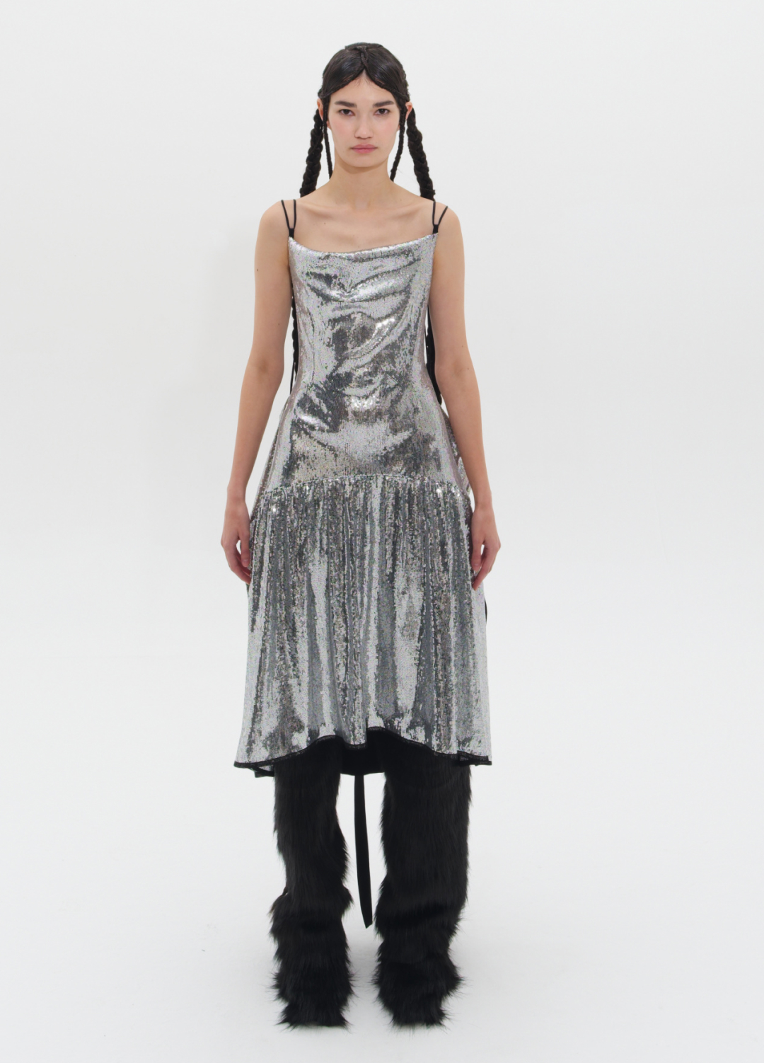 Спереди «доспехи» из пайеток, сзади простое черное, как фартук, платье с поясом, которым можно подчеркнуть талию. На Новый год — с серебряными босоножками. А после мы бы носили это платье поверх брюк, с пиджаком и обувью в мужском стиле вроде оксфордов и лоферов.