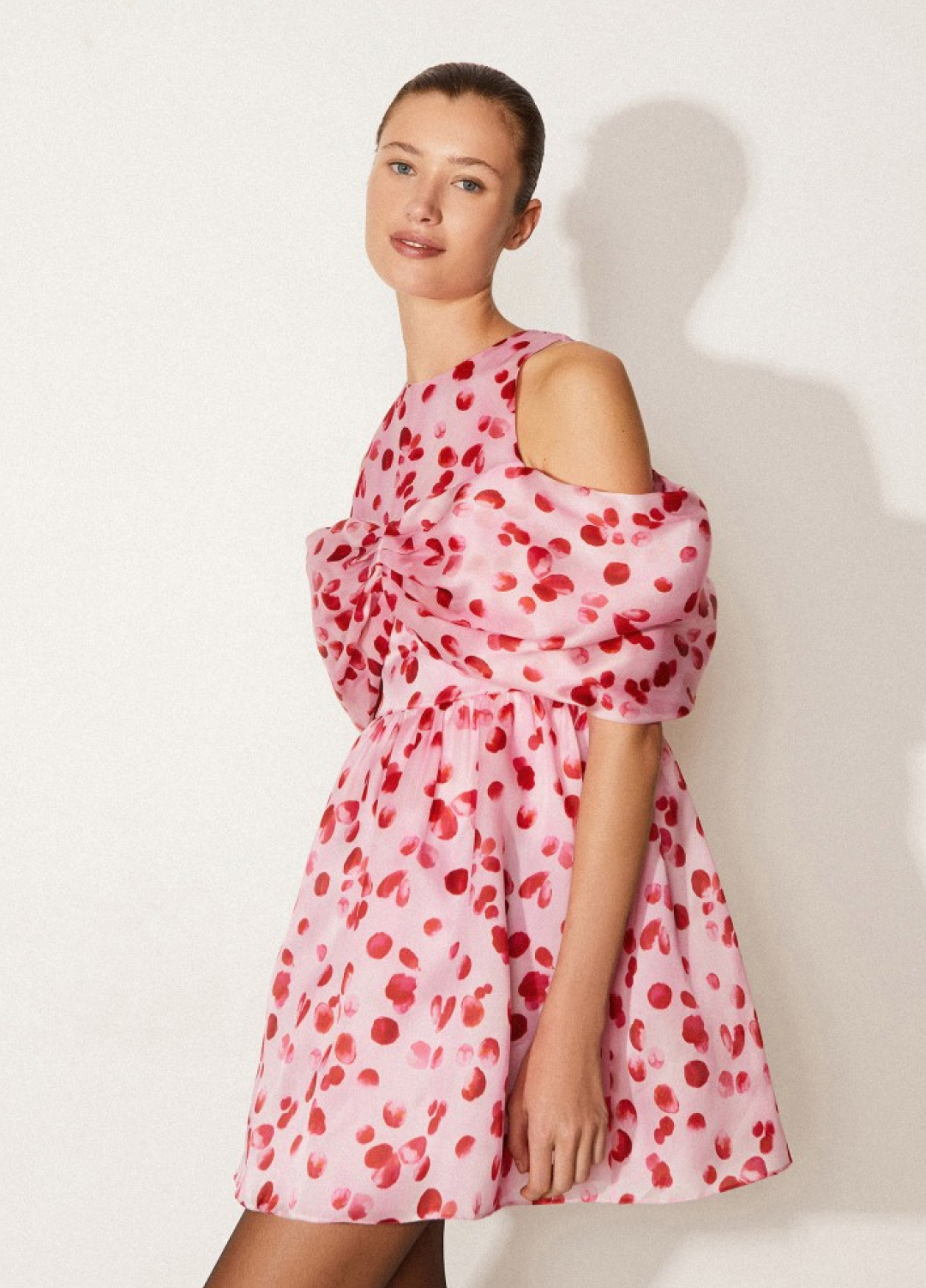 Шелковое платье легкое, как розовые лепестки, но полностью непрозрачное — к нему идет подклад из тонкого шелка и вискозы. Бант из тафты хорошо держит форму, плюс его можно положить на плечи, как нравится — повыше, пониже или асимметрично.