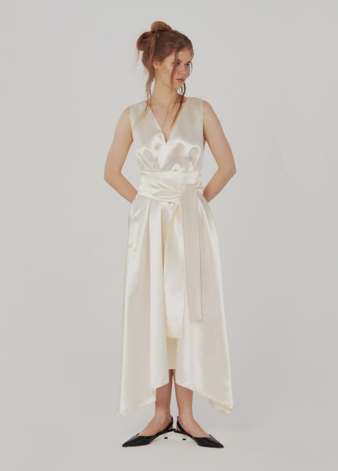 3 в 1 — платье, кейп и шлейф. Объемную деталь можно завязать на шее, как кейп, или распустить — тогда получится шлейф. Креативный директор Ushatáva Нино Шаматава предлагает носить платье с пиджаком — и завязывать кейп прямо поверх него. Платье у бренда есть в бежевом и черном цветах.