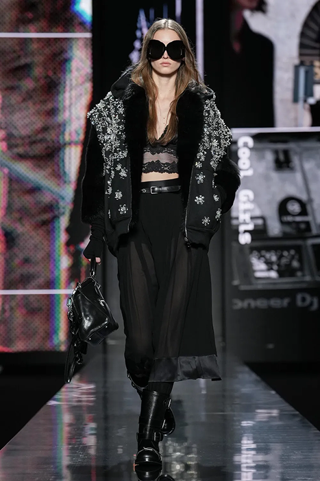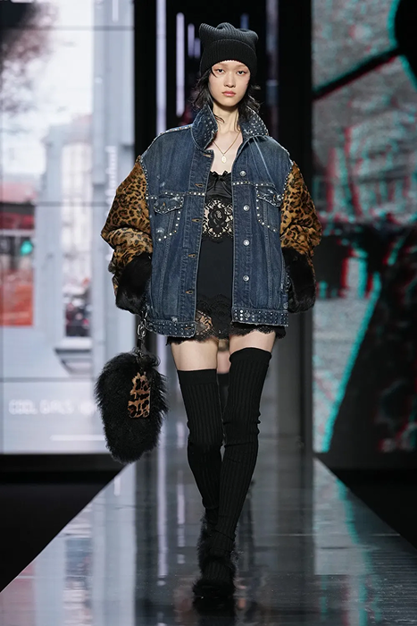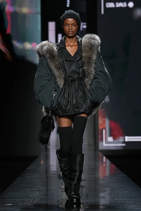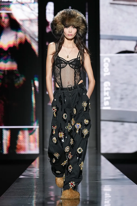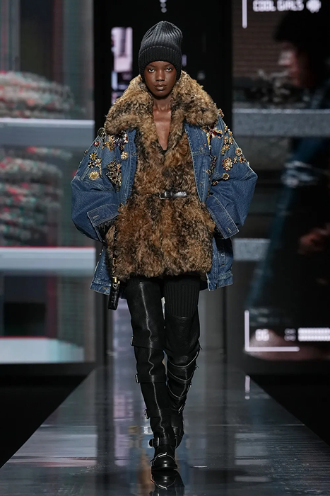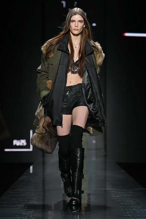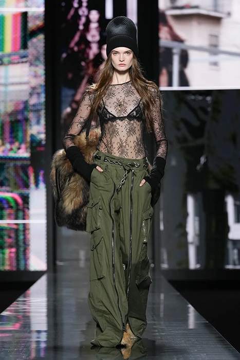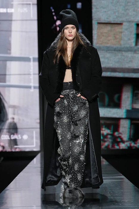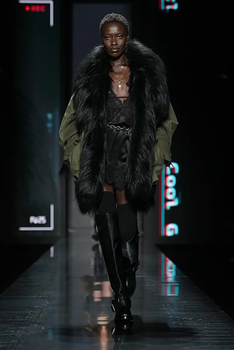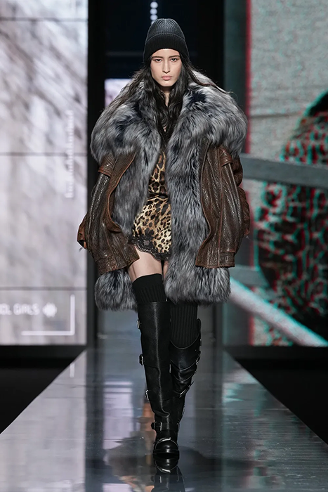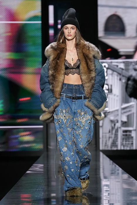 Итак, кто такая cool girl, по версии Доменико и Стефано? Отвечаем. Она носит парки с мехом (материал триумфально закрепил за собой звание главного в Милане) и выбирает бутылочно-зеленый; ей нравятся винтажные футболки и кружевные топы, карго, меховые миди и атласные мини-юбки. Она с удовольствием миксует «пижамные» штаны, расшитые крупными брошами, с ушанкой. В ее гардеробе мирно сосуществуют друг с другом «драгоценный» кожаный жилет, худи, «леопард», деним (также увенчанный стразами или декорированный мехом) и с десяток платьев — из сетки, кружева или полностью инкрустированных всем самым блестящим, что нашлось в шкатулке с украшениями. Они, к слову, появились даже на резиновых сапогах.