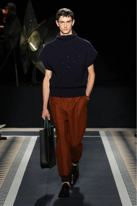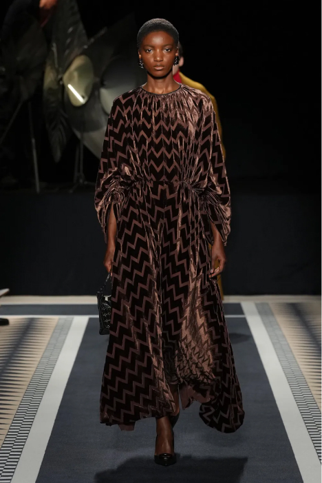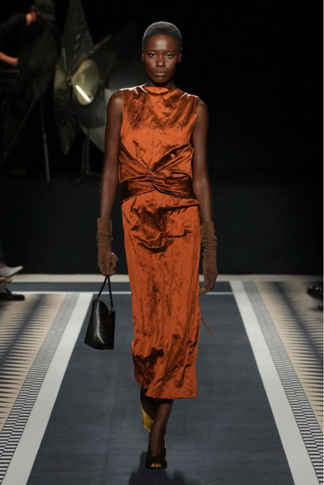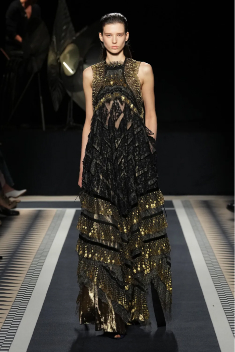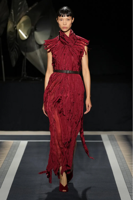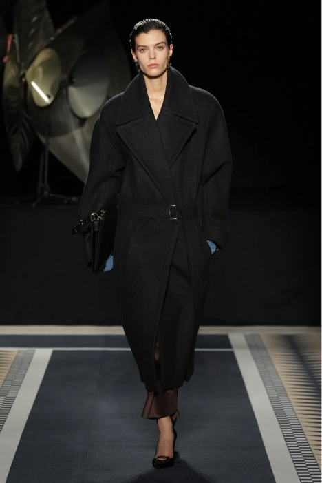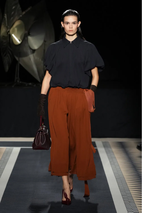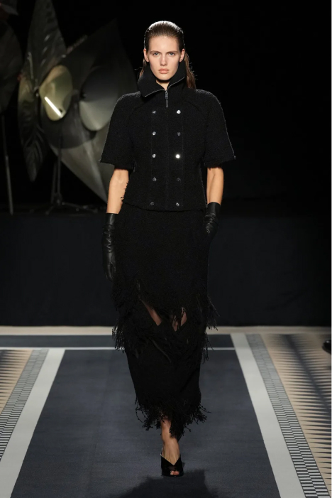 Здесь были пальто-бушлаты в паре с узкими юбками, и ассиметричные и драпированные платья (очень "по-ланвановски"), и изумительная игра с цветом (охровым, горчичным, темно-синем, серым, изумрудным). Фирменные для Lanvin накидки с декоративными заклепками, которые стали частью прозрачного блузона. Талию кожаных пальто Коппинг намерено опустил вниз, отдав дань уважения 20-м, а жакет из твида осовременил за счет высокого воротника, который проще представить на аутдор-свитерах. Прямое платье 1925 года дизайнер превратил в красивый мужской блузон, расшитый бисером и стеклярусом, а мерцающее в финале шоу, напоминающее слиток золота, юбка которого была будто собрана из лепестков, стало, своего рода, реинкарнацией силуэта robe de style Жанны Ланвен. Понравились пальто-кейпы с бахромой; юбка, деликатно скрепленная со свитером массивной булавкой; баклажанный тренд с массивными перчатками; кожаный топ и изящные туфли с пикантным мыском и узелком на нем.