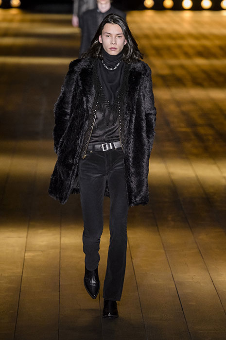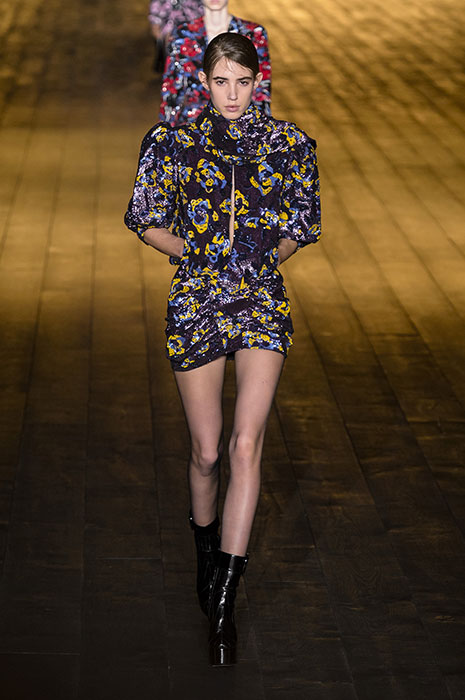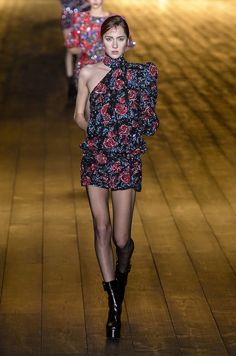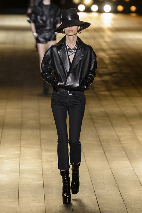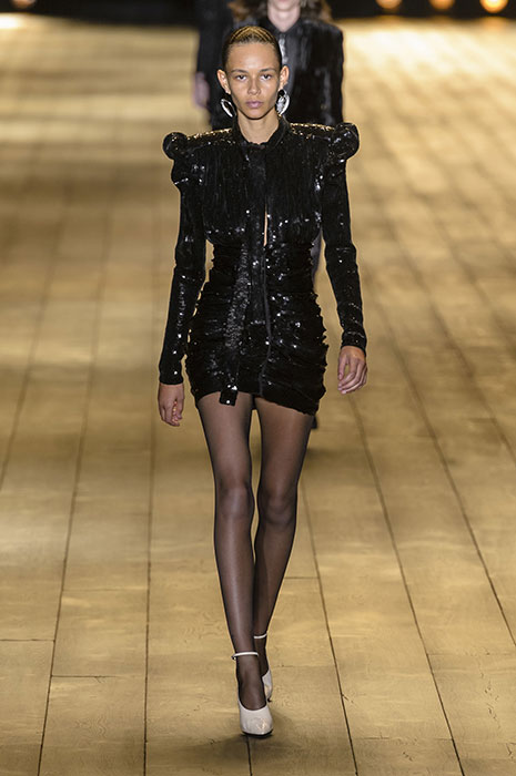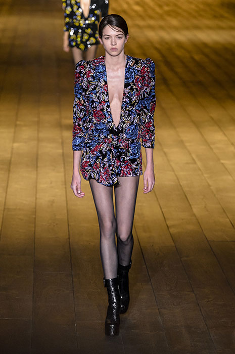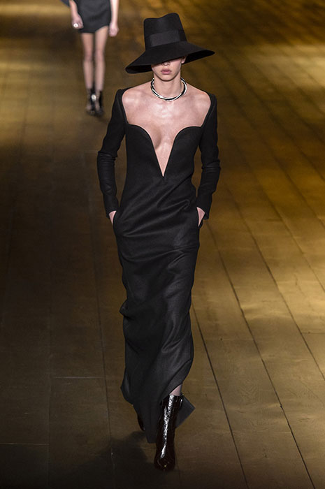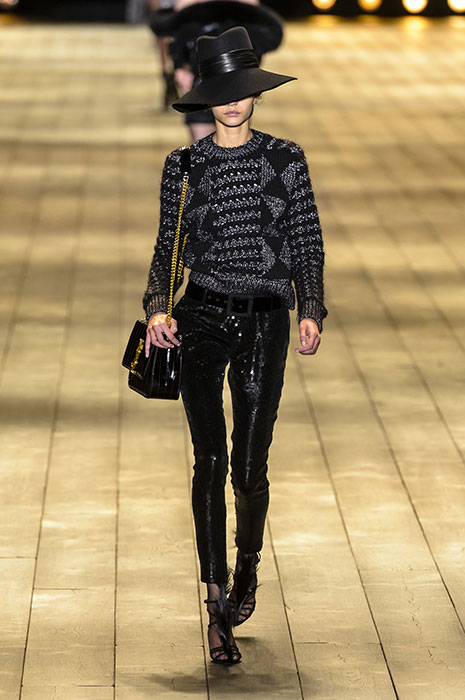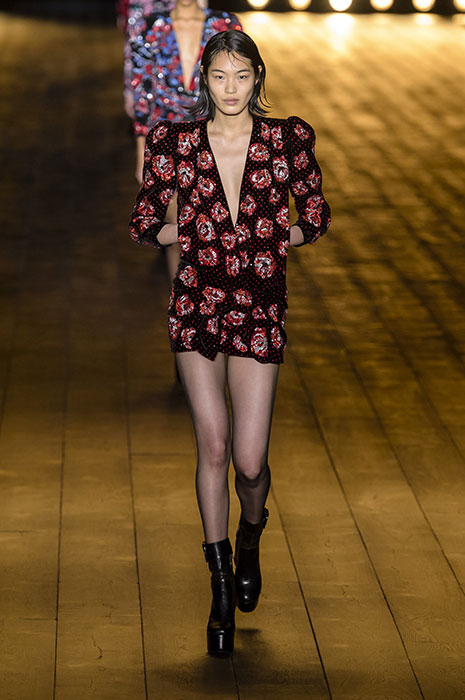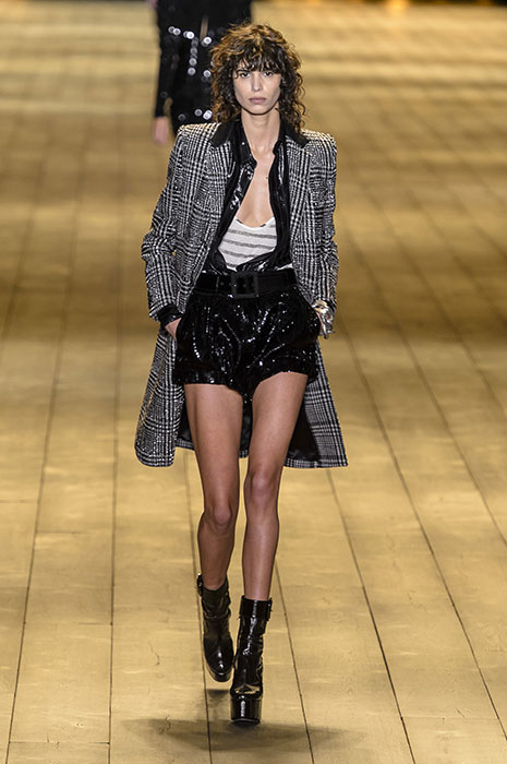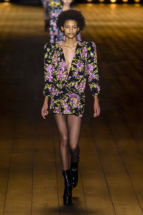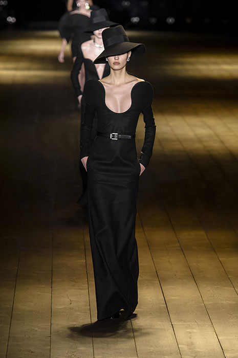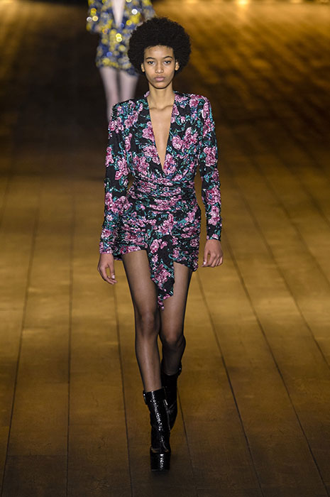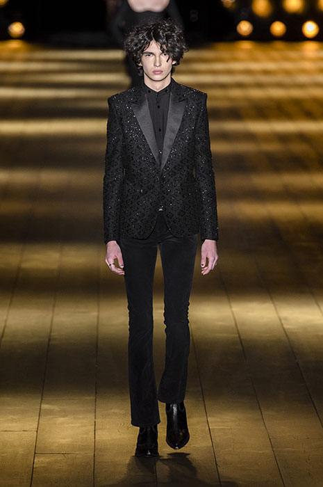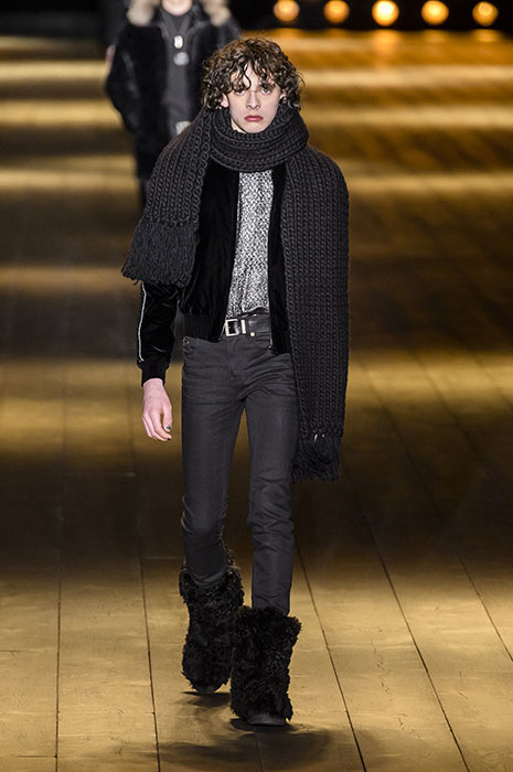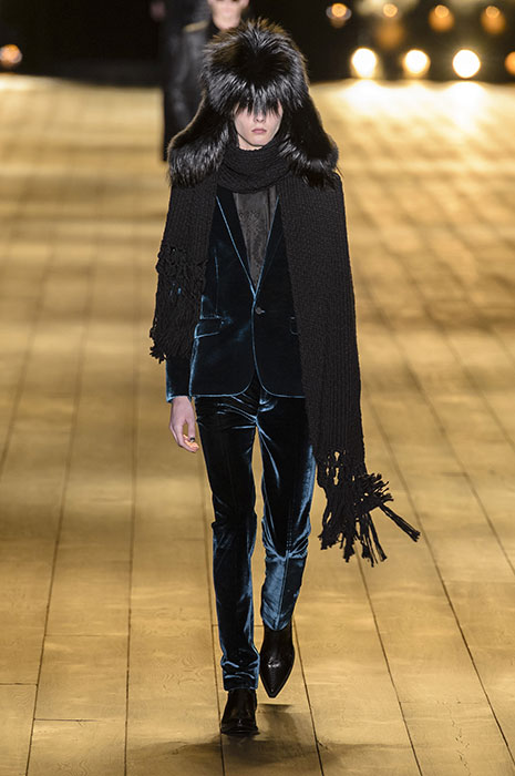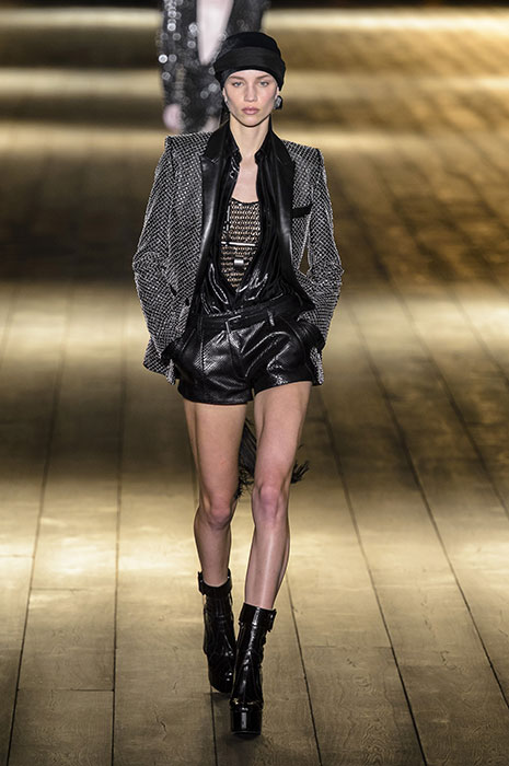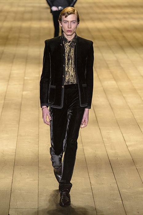 Энтони Ваккарелло остается верным себе — кожаные мини-шорты, высокие тяжеловесные платформы и платья с (очень) глубоким вырезом и объемной линией плеч в духе 80-х снова заняли центральное место в коллекции, которая по духу получилась максимально молодежной и панковской. Тем не менее в череде луков для миллениалов можно увидеть и взрослые, элегантные образы, а также отсылки в архивам Ива Сен-Лорана — например, тюрбаны времен 70-х и принты из русской коллекции 1976 года. Мужские образы традиционно состояли из брючных костюмов силуэта skinny (в этот раз сшитые из вельвета и бархата), а по духу мужская линия также тяготеет к 70-м — скажем, к стилю молодого Мика Джаггера.