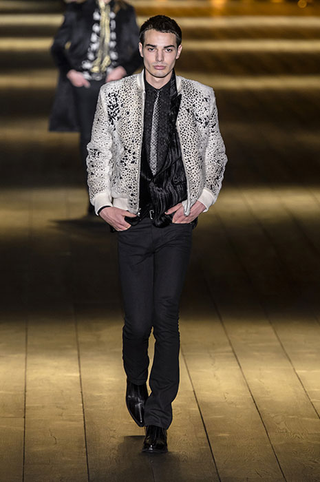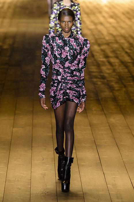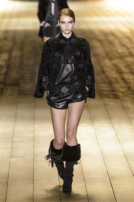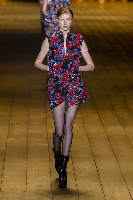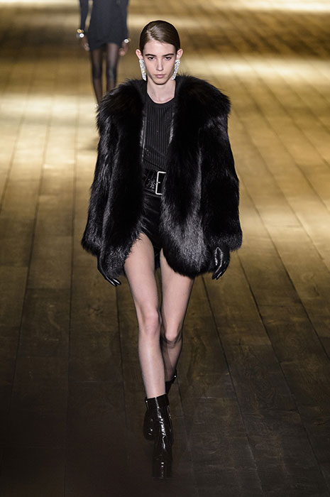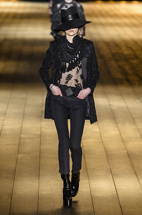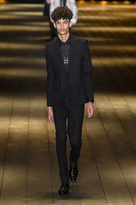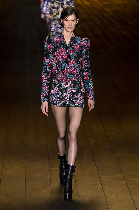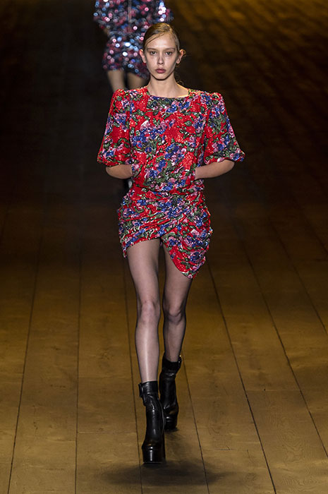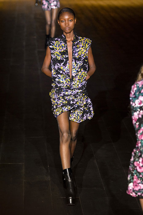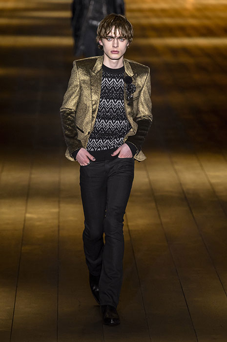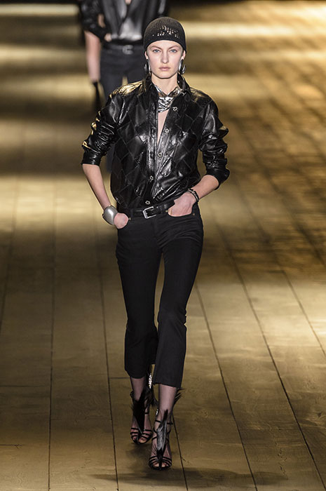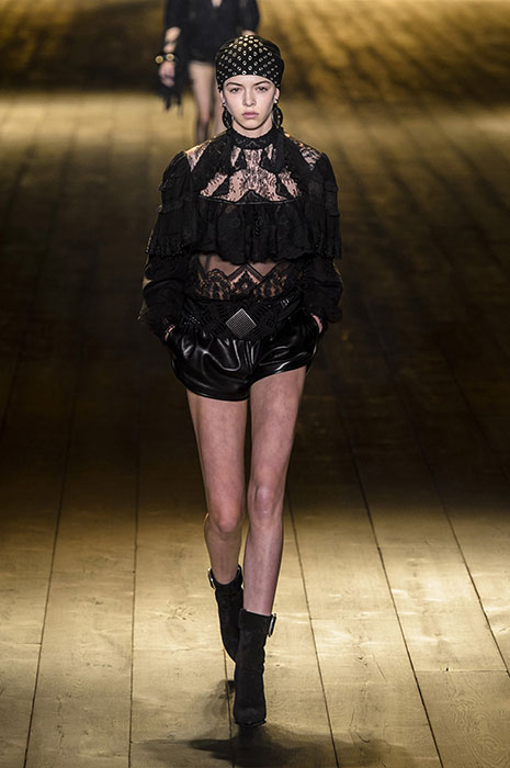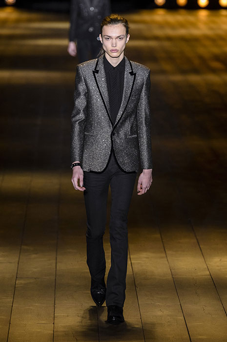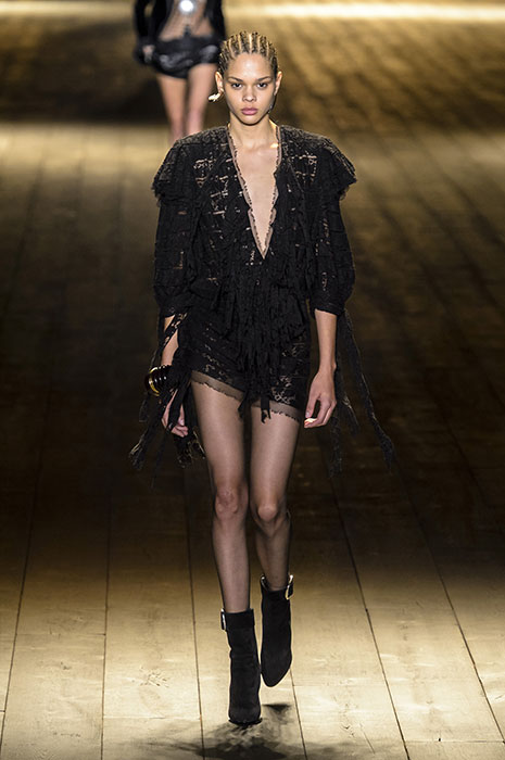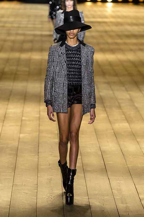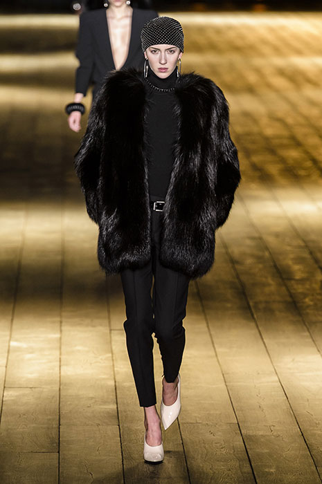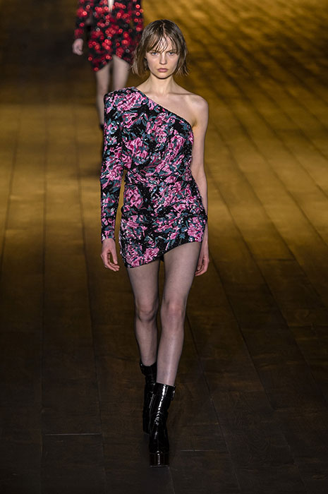Энтони Ваккарелло остается верным себе — кожаные мини-шорты, высокие тяжеловесные платформы и платья с (очень) глубоким вырезом и объемной линией плеч в духе 80-х снова заняли центральное место в коллекции, которая по духу получилась максимально молодежной и панковской. Тем не менее в череде луков для миллениалов можно увидеть и взрослые, элегантные образы, а также отсылки в архивам Ива Сен-Лорана — например, тюрбаны времен 70-х и принты из русской коллекции 1976 года. Мужские образы традиционно состояли из брючных костюмов силуэта skinny (в этот раз сшитые из вельвета и бархата), а по духу мужская линия также тяготеет к 70-м — скажем, к стилю молодого Мика Джаггера.