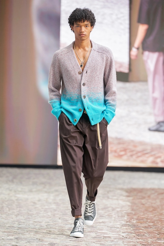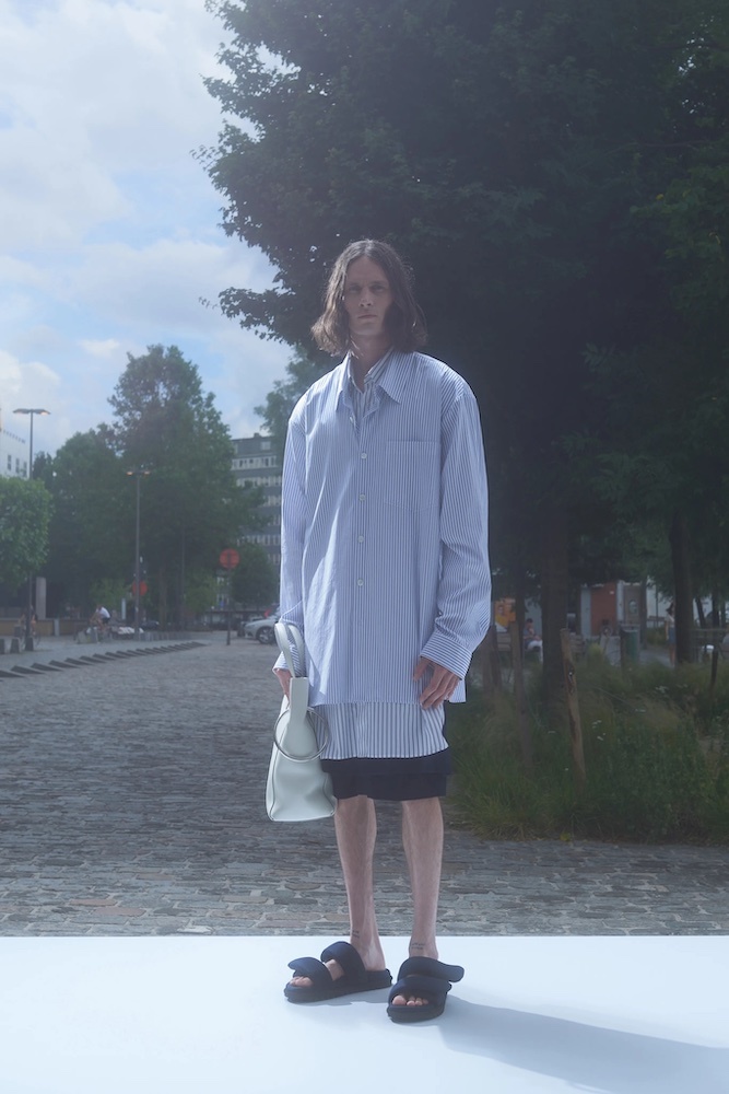 Все 55 кадров лукбука мужской коллекции Дриса ван Нотена сделаны в разных точках Антверпена. В принтах вещей дизайнер тоже отдает дань уважения городу: кроме работ фламандцев Рубенса и Брейгеля, на рубашках можно разглядеть индустриальные пейзажи — эти снимки взяты из смартфонов команды Dries van Noten. Буква «А» повторяет логотип Антверпена 1970-х годов. Идея самой коллекции звучит так: после вновь обретенной свободы люди хотят одеваться свободно. Для этого в коллекции есть объемные плащи, широкие брюки и шорты, удлиненные свободные рубашки с коротким рукавом. Костюмы тоже присутствуют, но сделаны из шелка и весят не более 200 грамм. В линии обуви — сандалии с «дутыми» ремешками, кожаные шлепанцы и гибридные мокасины на платформе.