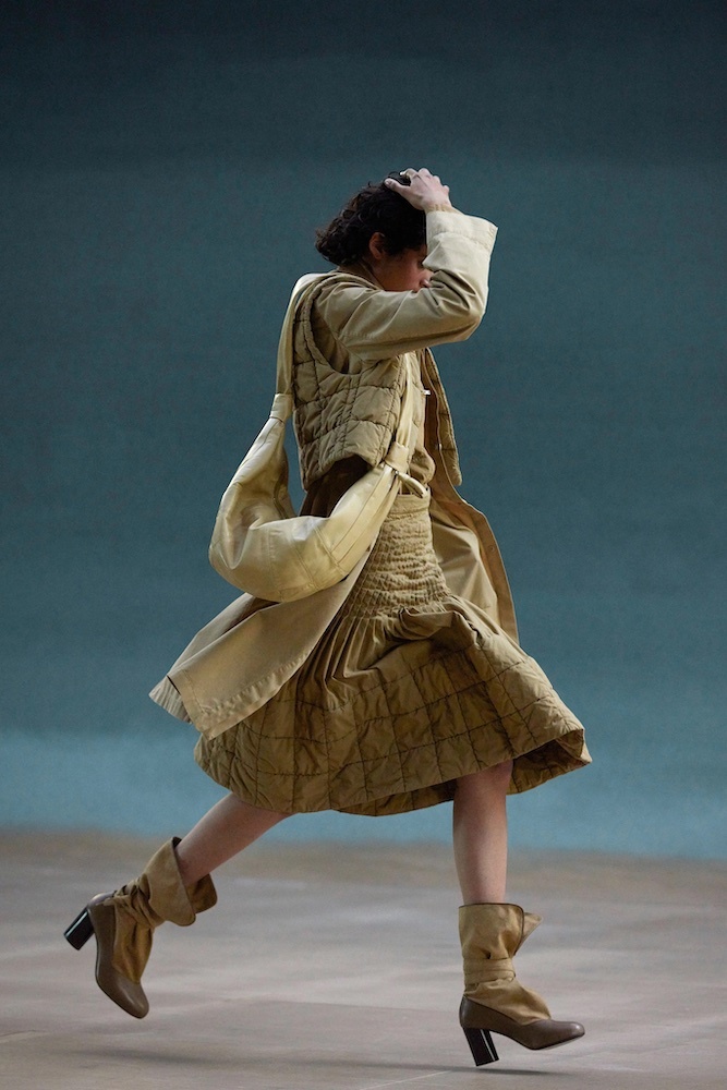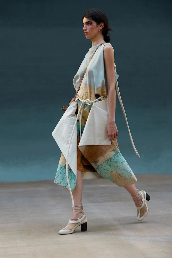 Одежда Lemaire легка и функциональна, она подходит разным людям и для разных ситуаций, с ней легко составлять многослойные образы. В коллекцию нового сезона вошли свободные пиджаки и подвернутые кюлоты вместо брюк, рубашки с коротким рукавом и шелковые драпированные платья на каждый день. У курток и жилетов вместительные карманы, силуэты платьев и летних плащей регулируются ремнями и шнурами, а стеганая юбка превращается в одеяло для пикника. «Это одежда, которая заботится о вас», — говорит дизайнер Сара-Лин Тран. Вещи выполнены в спокойной гамме (беж, охра, оттенки серого и коричневого), а для принтов рубашек и шелковых платьев использованы работы художника-пейзажиста Джозефа Йоакума.