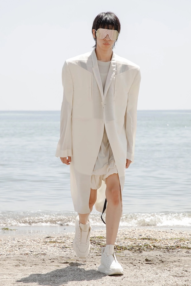 Последние три шоу Рик Оуэнс проводил на острове Лидо в Венеции, где сейчас живет. Шоу мужской коллекции сезона весна-лето 2022 стало закрывающим показом венецианской истории. Большинство образов — в белом: расклешенные джинсы, струящиеся топы, пиджаки с большими плечами, туники со шлейфом и куртки в перьях. Оуэнс сотрудничал с ателье Maison Février, которое специализируется на работе с перьями. Крупные ожерелья и фурнитура сделаны совместно с Goossens, еще одним кутюрным ателье. Для коллекции использован японский деним, сотканный на старых аутентичных станках. К ботинкам на платформе крепились портативные генераторы дыма — их бренд собирается выпускать отдельно в трех размерах.