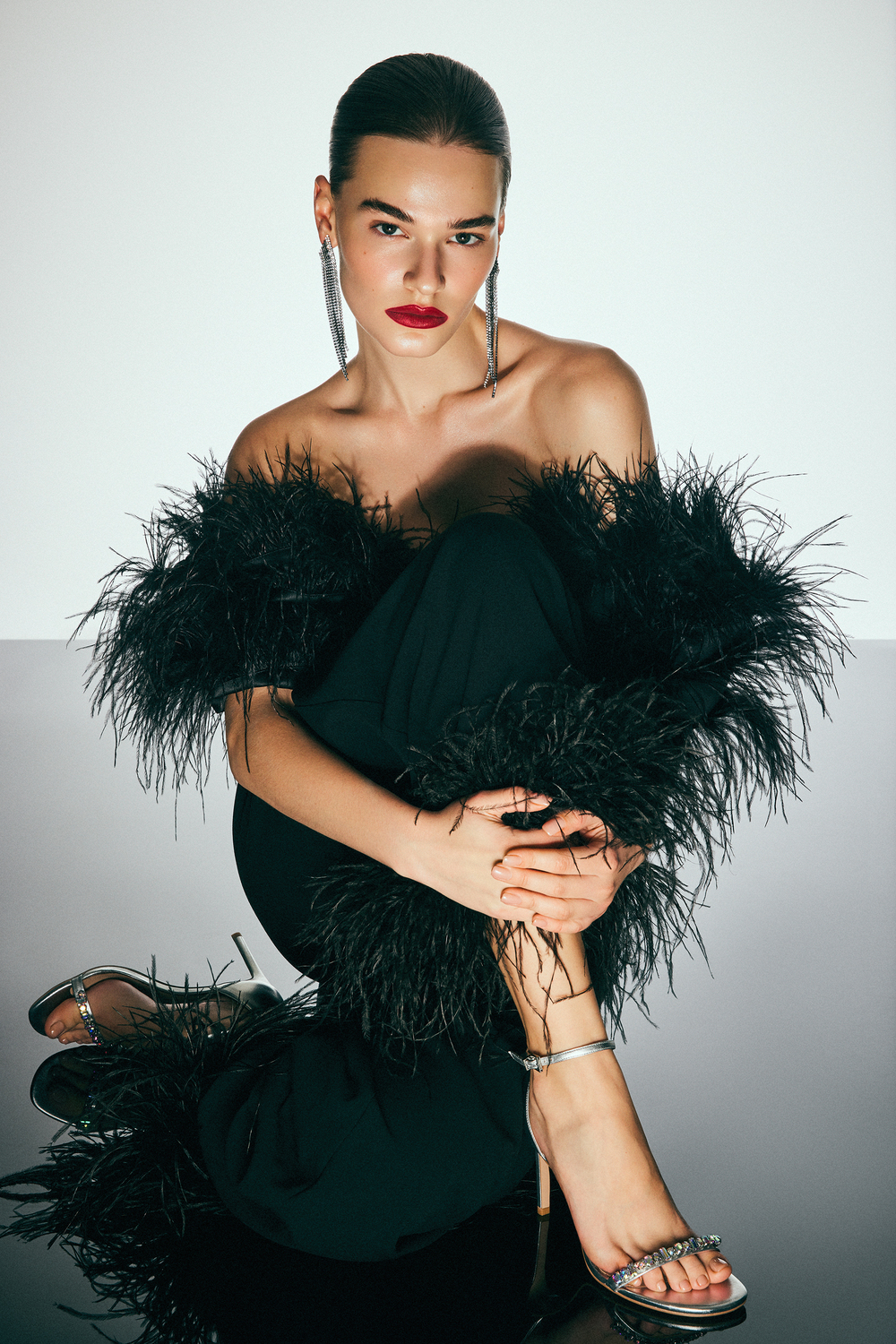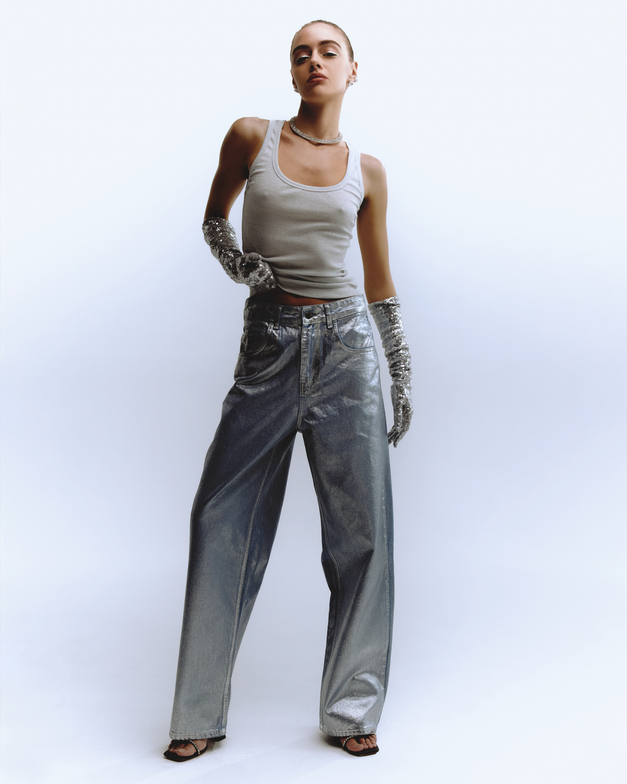Первое, на что падает взгляд в новогодней коллекции бренда, — это широкие джинсы с напылением металлик. С такими даже белая майка будет выглядеть празднично. Если этого недостаточно, можно пуститься во все тяжкие и укрыться перьями и блестками с ног до головы: для этого есть жакеты с бахромой из цепочек, мини в пайетках, кроп-топы в перьях и туфли со стразами на ремешках.