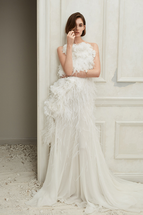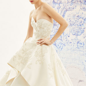 В весенне-летней коллекции Oscar de la Renta, представленной на Нью-Йоркской неделе моды, дизайнеры Фернандо Гарсия и Лаура Ким отошли от цитирования коллекций Оскара де ла Ренты и показали собственный мэш-ап культур с юбками-саронгами, индийской вышивкой, бахромой, перьями, кафтанами и марокканскими мотивами. Но в свадебной коллекции дизайнеры крепко держатся курса самого де ла Ренты — только классические силуэты, которые полностью отвечают самым строгим правилам хорошего тона. Впрочем, от себя дизайнеры добавили аппликации в виде листьев папоротника, модели с топом из перьев и закрытые платья, расшитые крошечными цветами, которые должны быть актуальны на Востоке.