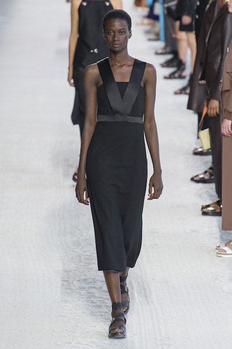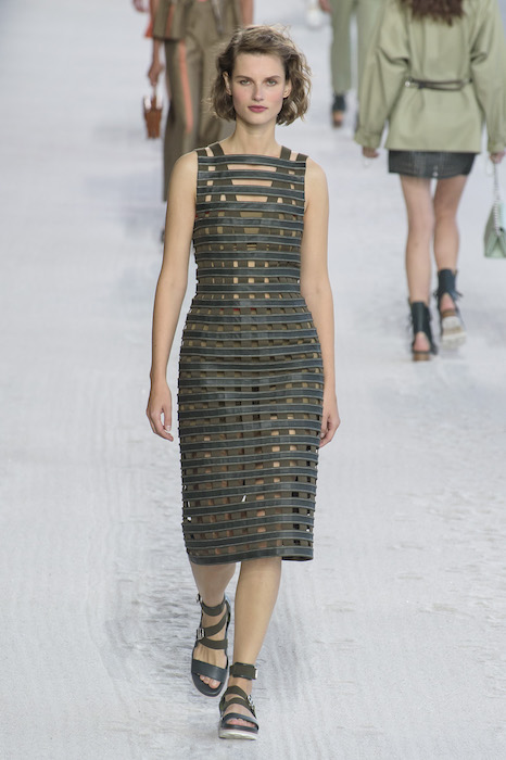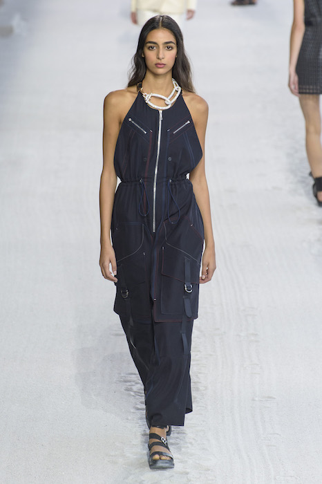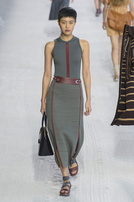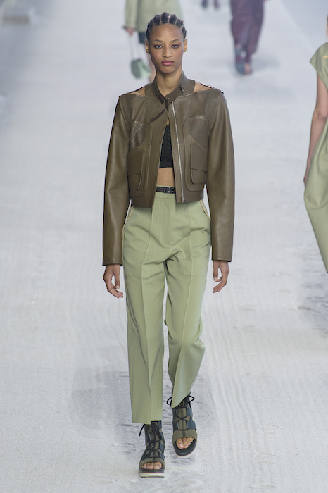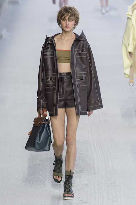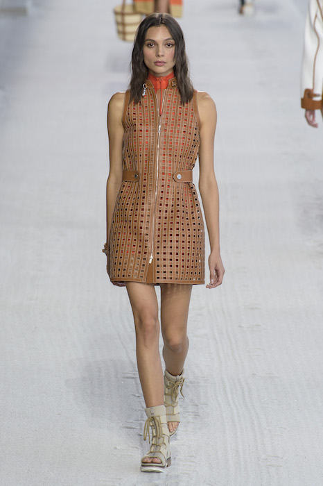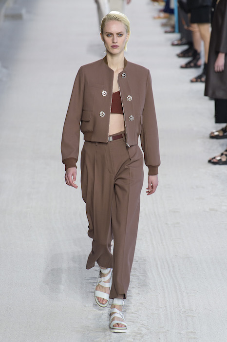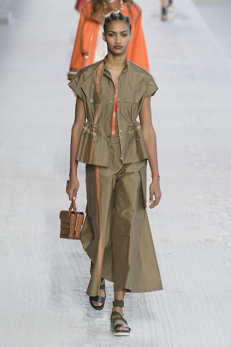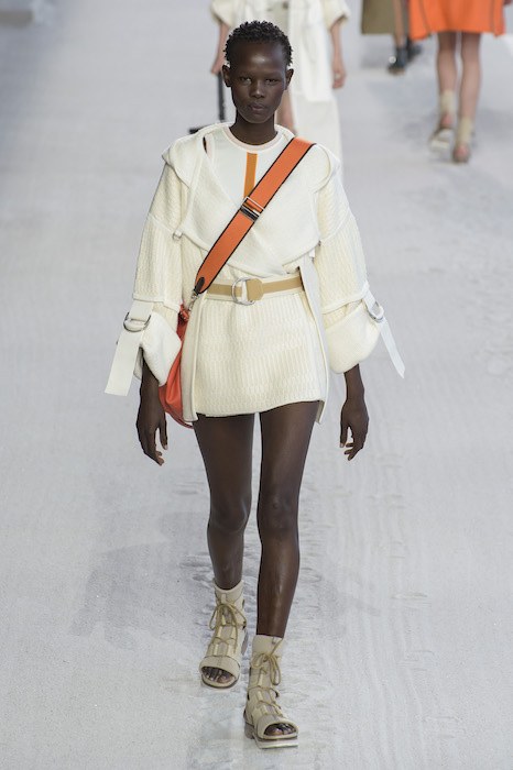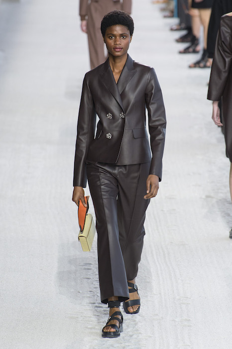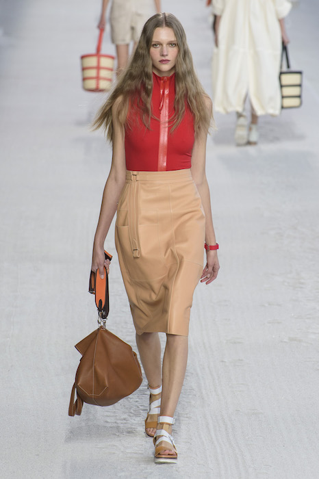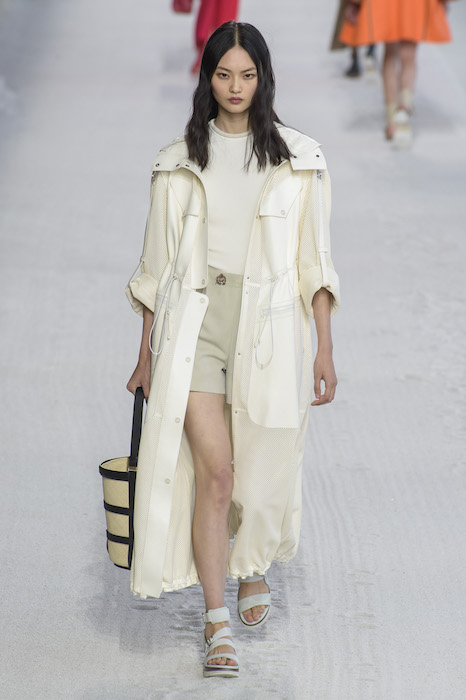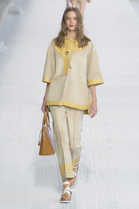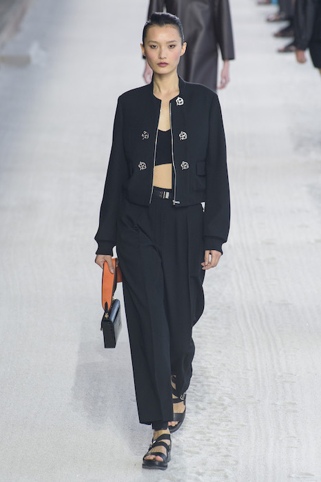 Целостность — важное свойство образов Hermes. В новой коллекции одежда тесно связана аксессуарами и обувью — ремни, сумки, сандалии и даже такие детали, как шнурки на топах или кулиски, как на спортивных вещах, у Надеж Ване-Цыбульски корректируют силуэты и подчеркивают пропорции всех этих кожаных комплектов с перфорацией и большими карманами. Отдельно хочется отметить атмосферу шоу: показ проходил под адажио Моцарта на ипподроме в Булонском лесу.