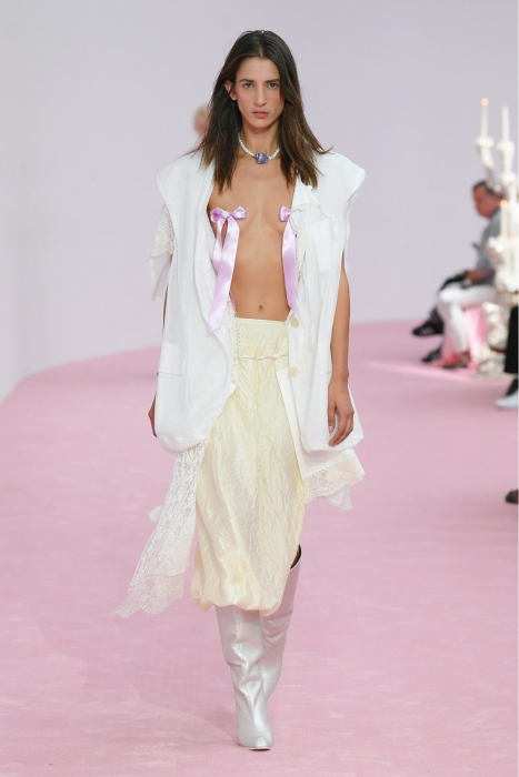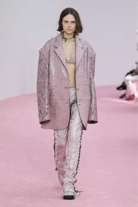 Acne Studios отметил свое 10-летнее присутствие на Неделе моды в Париже. Гостей усадили на большие розовые кровати, шоу проходило под живое выступление Eartheater. В самой коллекции было несколько свадебных образов: кружевные мини с лентами, задрапированные платья в объемных сердцах, из лоскутов кружева и с бахромой. По словам дизайнера Йонни Йоханссона, свадьба — одно из самых серьезных событий в жизни, но при этом нелепое и китчевое. На контрасте с нежными свадебными образами шли пальто из потертой кожи с шипами, рваный трикотаж и костюмы с дырами, залатанными красными розами. Из сезона в сезон Acne Studios работают с «домашними» вещами: в новой коллекции есть костюмы в клетку виши, как со скатертей, квадратные платья с вырезами, словно сшитые из пододеяльников, и фата из кружевных салфеток. Котята и бантики на сумках — авторства американской художницы Карен Килимник.