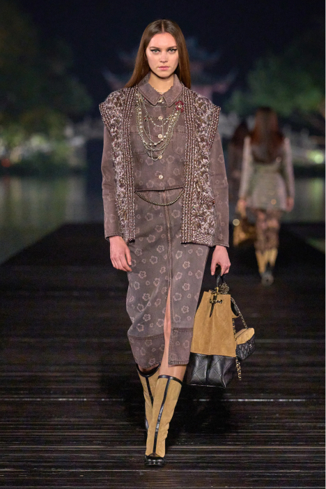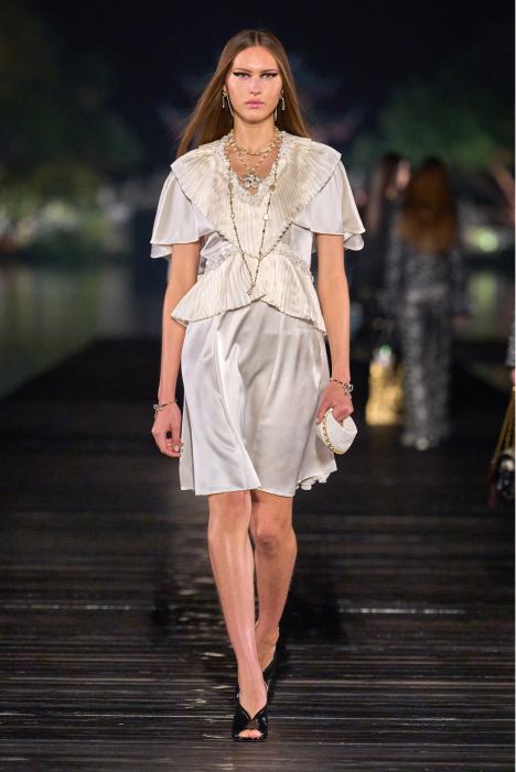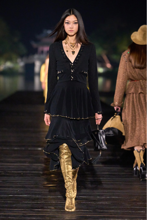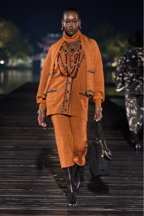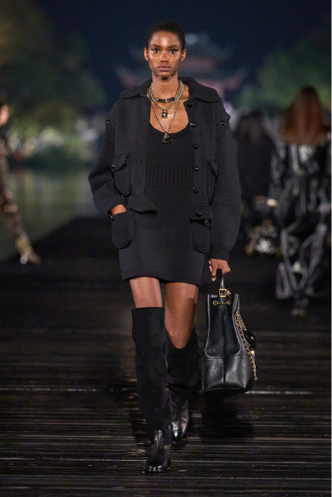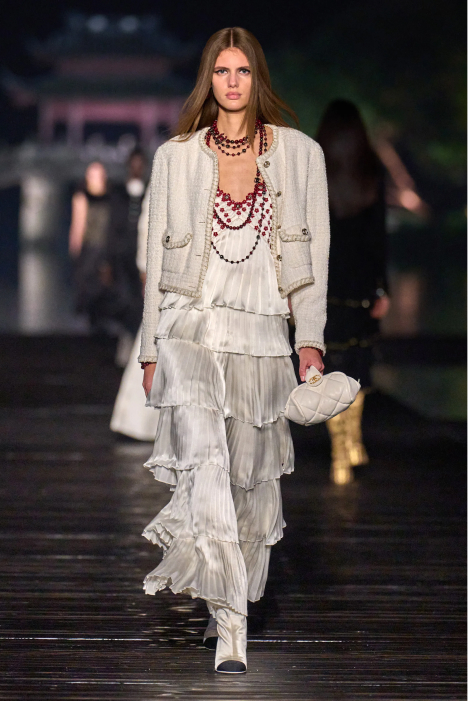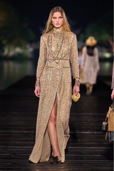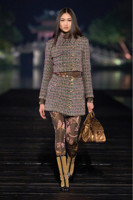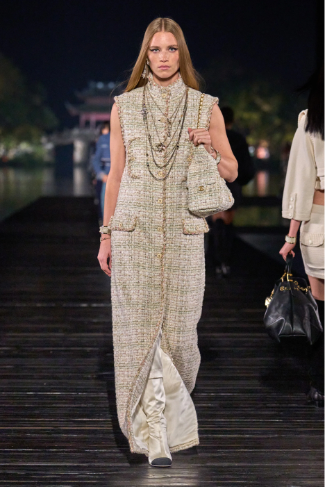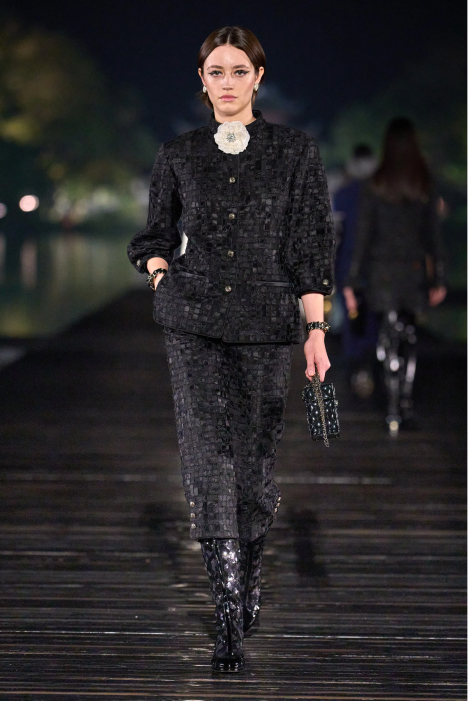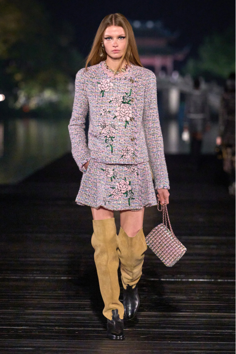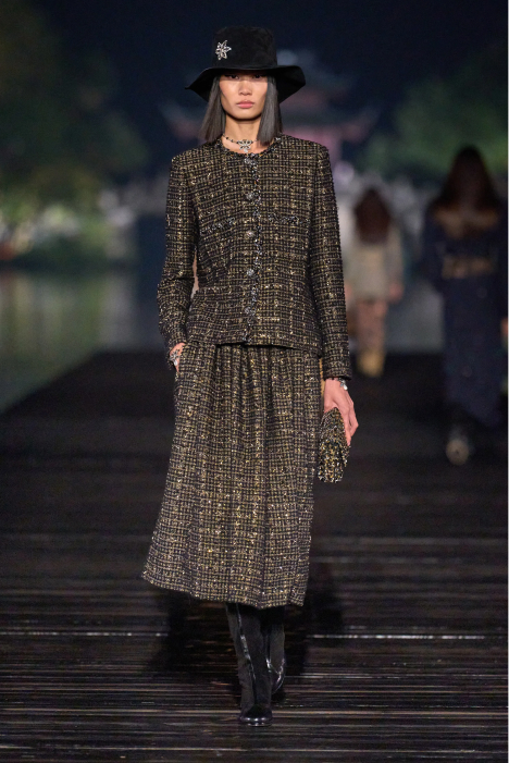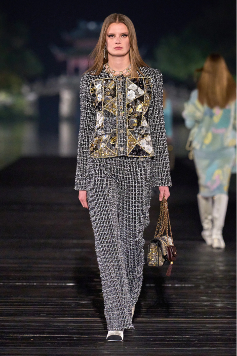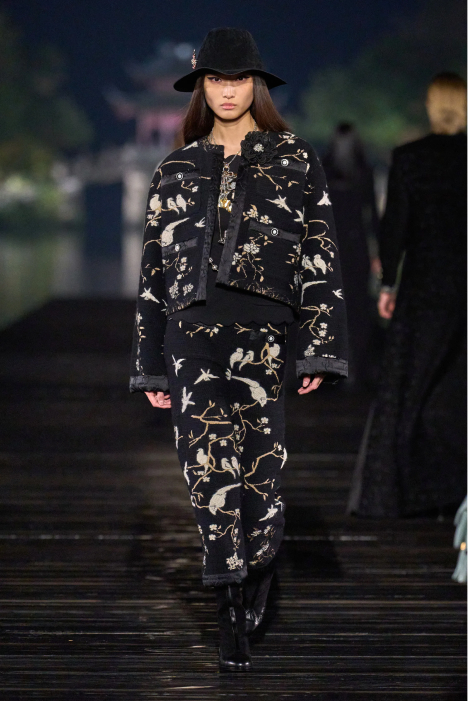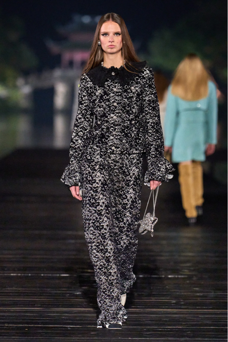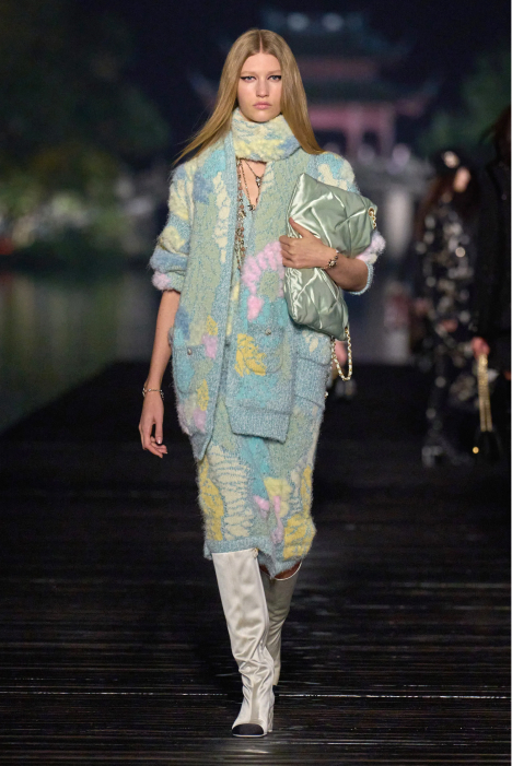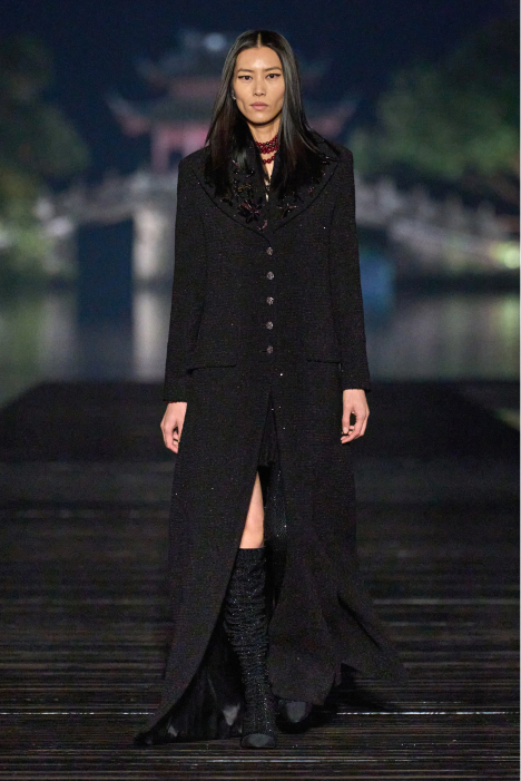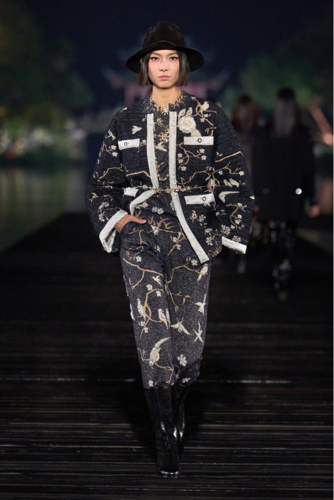 Выбрав в качестве локации озеро (в точности то, что красовалось на ширме), команда модного дома начала показ с десятка total black образов: длинных пальто, атласных тренчей и твидовых костюмов. Следом снова шли твидовые комплекты, но уже те, что надевали поверх трикотажных боди с интерпретацией сюжетов с ширм, и те, на которых распускались цветы, напоминающие дивные китайские сады. Здесь было много золота, перламутра и даже отороченных мехом курток-одеял. Последние невольно напоминали о связи Коко с Россией.