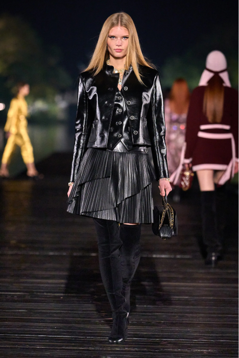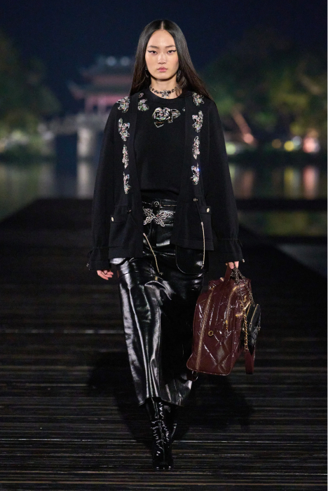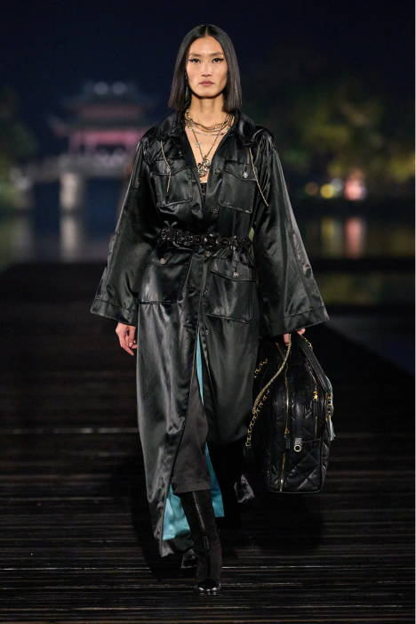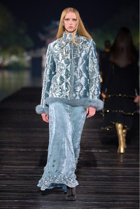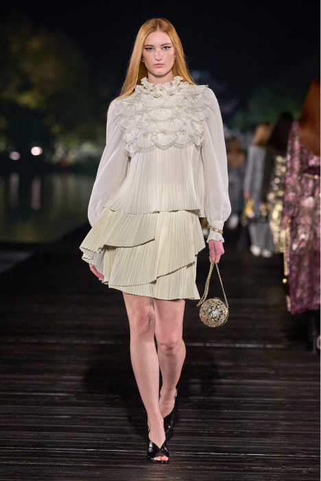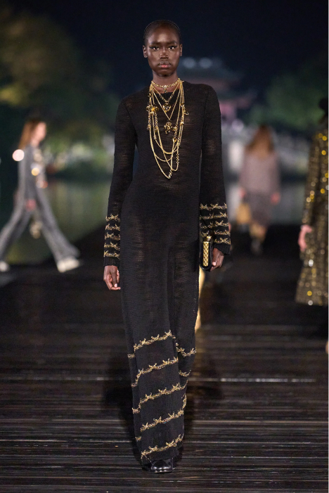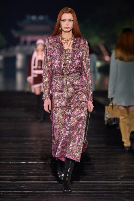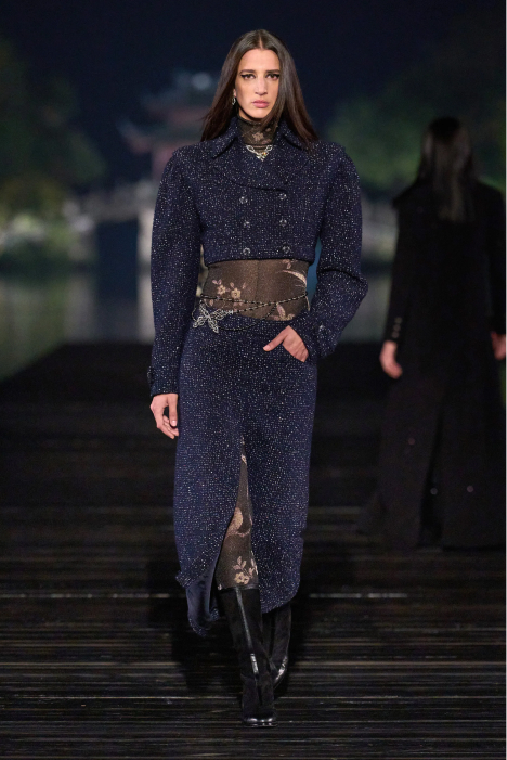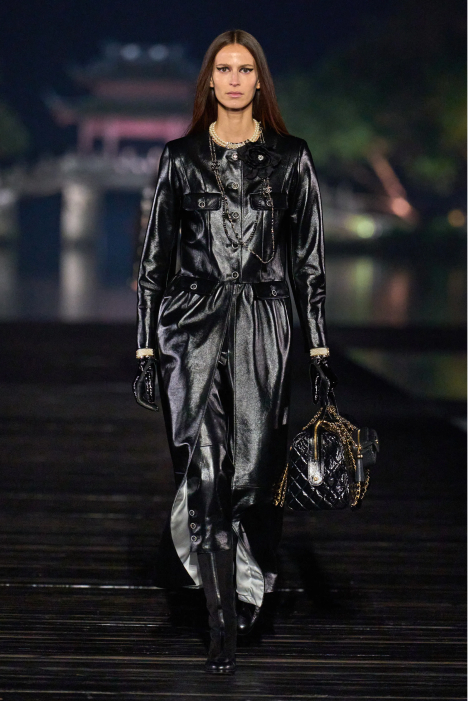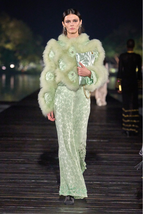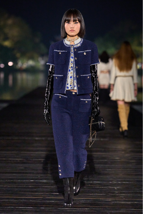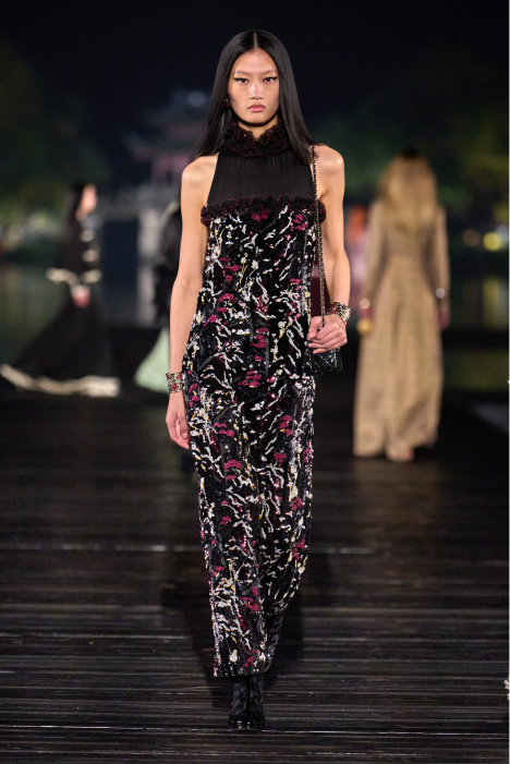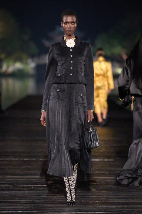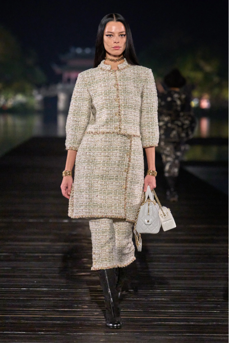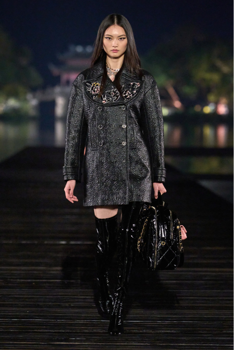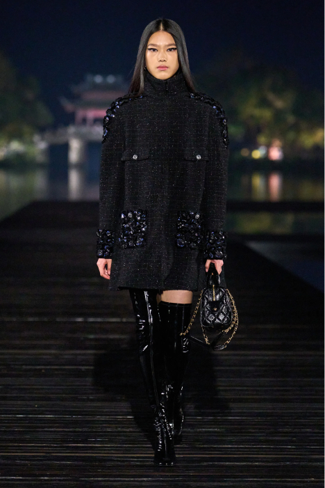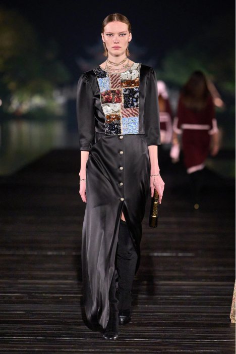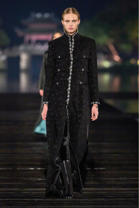 Выбрав в качестве локации озеро (в точности то, что красовалось на ширме), команда модного дома начала показ с десятка total black образов: длинных пальто, атласных тренчей и твидовых костюмов. Следом снова шли твидовые комплекты, но уже те, что надевали поверх трикотажных боди с интерпретацией сюжетов с ширм, и те, на которых распускались цветы, напоминающие дивные китайские сады. Здесь было много золота, перламутра и даже отороченных мехом курток-одеял. Последние невольно напоминали о связи Коко с Россией.