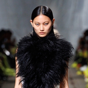 Отсюда в коллекции, состоящей из 63 черных и только черных образов, находим не только больше десятка по-настоящему кутюрных платьев (полу- и совсем прозрачные, декорированные перьями, пайетками, кружевом), но и те вещи, которые будем носить каждый день. Например, костюм с юбкой-солнцем и оверсайз жакетом из кожи; минималистичные мини-платья и однобортные прямые пальто; прозрачные миди-юбки и свитеры крупной вязки; костюмы, шорты выше колена и лаковые плащи с аппликациями. Аксессуары — остроносые туфли, сапоги с пряжкой, балетки с ремешком, шопперы с бахромой, хобо и вечерние сумочки, оперные перчатки, тонкие ремешки, серьги и очки — тоже были в черном. Собственно, как и цвет губ моделей.