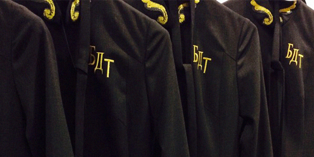 Эту форму Татьяна Парфенова разработала для Большого драматического театра имени Г. А. Товстоногова пять лет назад — сотрудники театра носят ее до сих пор. Самое приятное, что модному дому не ставили никаких рамок — Татьяна Валентиновна была абсолютна свободна в создании дизайна. Так получились темно-серые платья с карманами из тонкой шерсти — их воротники-стойки и манжеты расшиты золотой нитью.
