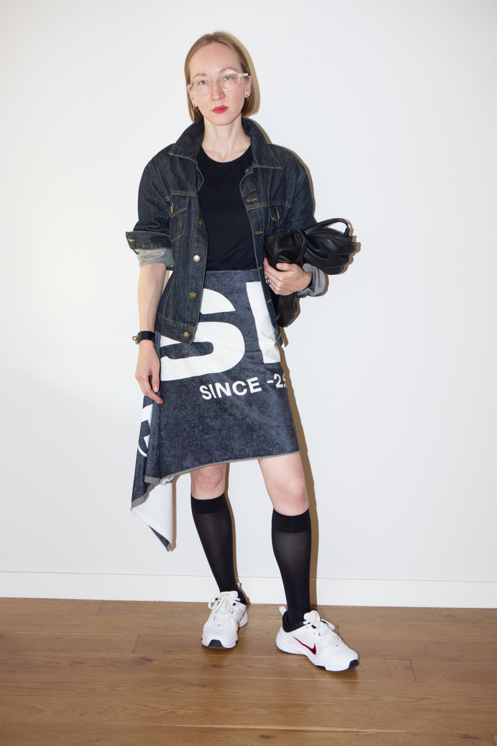 Продлеваем отпускной балдеж и ходим по всем городским и рабочим делам в махровой юбке. Где мы такую найдем? Конечно, сделаем сами — из полотенца Carne Bollente. Чем его фиксировать? Я использую большой канцелярский зажим, с ним получается юбка на запах. Для прямого силуэта можно использовать кожаный ремень. Облегающее боди без рукавов (есть такое у Maison Margiela), но с глухой горловиной — идеальный тандем. Любимые кроссовки и мягкий кожаный рюкзак помогают чувствовать себя расслабленно, а для игривости добавим черные гольфы. Прохладным вечером накинем джинсовую куртку. Голосую за Studio d’Artisan.