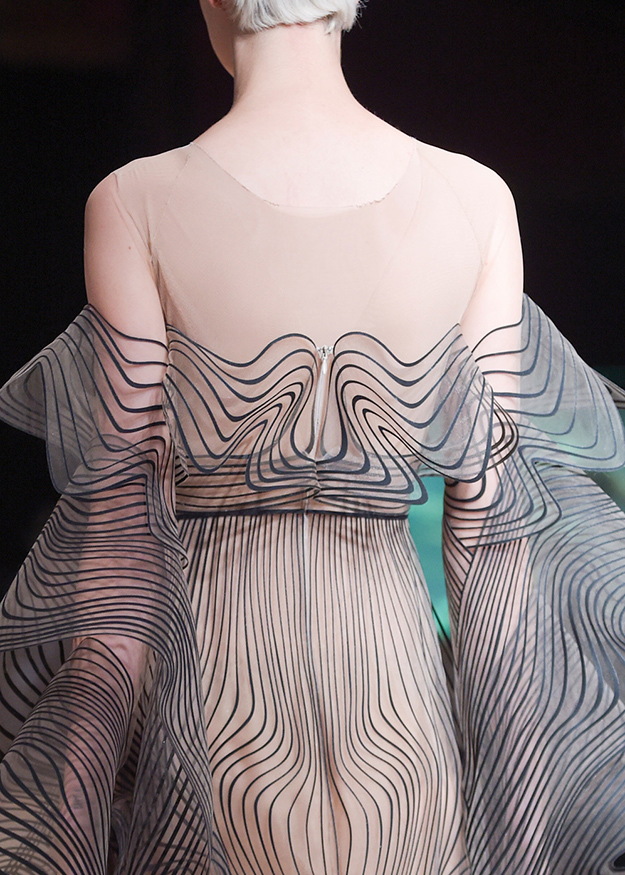 Голландский дизайнер Ирис Ван Херпен основала свой бренд в Амстердаме 10 лет назад, и последний показ на кутюрной Неделе моды стал юбилейным для дизайнера. В 2011 году Французская федерация кутюра пригласила дизайнера показывать свои коллекции, и с тех пор Ирис гнет свою линию. Ее эстетика, которая граничит с научной фантастикой, стоит особняком от всех остальных модных домов, которые показывают свои работы во время модного календаря, и последняя коллекция не стала исключением. Дизайнер находит новые способы создавать одежду: в платьях-конструкциях, которые, по словам дизайнера, призваны воссоздавать отношения воздуха и воды, соседствуют такие традиционные материалы, как органза, и ткани-стретч с техниками вроде 3D-печати и лазерной резьбы.