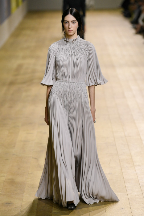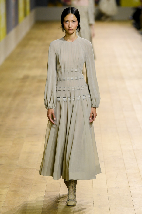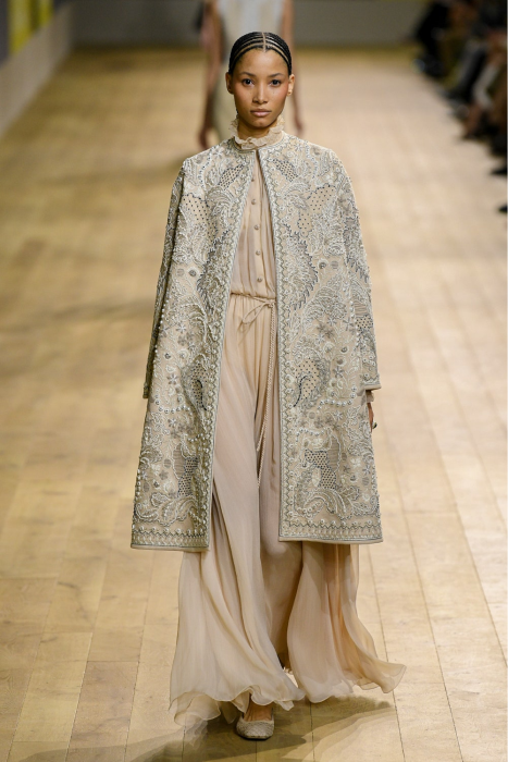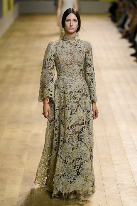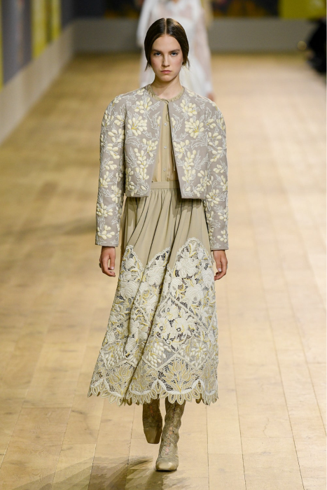В тизере шоу у сотрудников ателье Dior спрашивали, что такое фольклор. Они озвучили первые ассоциации: ручная работа, вышивки, буйство цветов, радость, традиции, связь со своими корнями. Эту тему и развивает Мария Грация Кьюри в новой кутюрной коллекции, в которую вошли платья со сложной вышивкой, платья-рубашки из белого кружева, юбки в плиссировку и укороченные жакеты с бахромой. Блузки со свободными рукавами, платья с высокими воротниками и клетчатые сарафаны напоминали о крестьянской одежде. Палитра включает простые оттенки серого, бежевого, немного красного и бордового, но больше всего — черного и белого. Dior сотрудничал с украинской художницей Олесей Трофименко — на фоне ее работ с традиционными орнаментами и проходил показ. Полотна были вышиты вручную мастерами Chanakaya School of Craft в Мумбае.