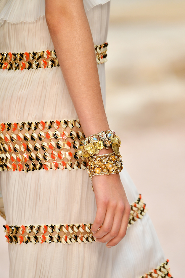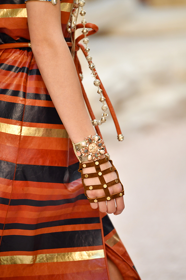Традиция эллинских одеяний в коллекции была обыграна при помощи струящихся драпировок, платьев, напоминающих по крою греческие тоги и хитоны, позолоченные нарукавники, пояса и сандалии. Особенное внимание Лагерфельд уделил деталям, которые также отсылали к теме Древней Греции — вместо пуговиц на жакетах красовались древние монеты, на головах моделей были повязки украшенные драгоценными канями, а золотые лавровые листы выступали в качестве подвесок.