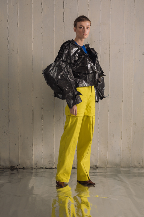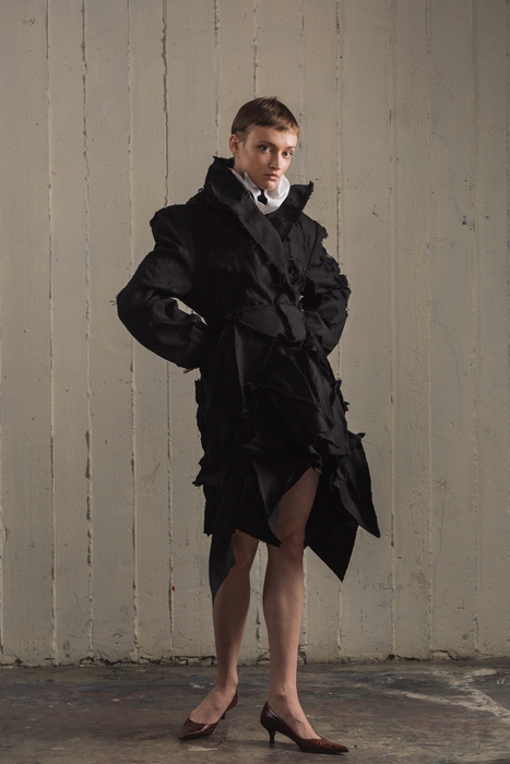 Общая концепция бренда Жени Малыгиной — антисезонность и антитренды. Но даже с отказом от тенденций петербургская неоготика Pirosmani все равно смотрится сверхактуально. Черный цвет в коллекции уступил дорогу вспышкам желтого, оранжевого и розового, сложноскроенные переливающиеся куртки и жакеты соседствуют с кружевными юбками. Есть даже полупрозрачные вечерние платья — впрочем, Pirosmani не был бы собой, если не сбалансировал суперженственный крой авангардным, как будто рваным декором.
