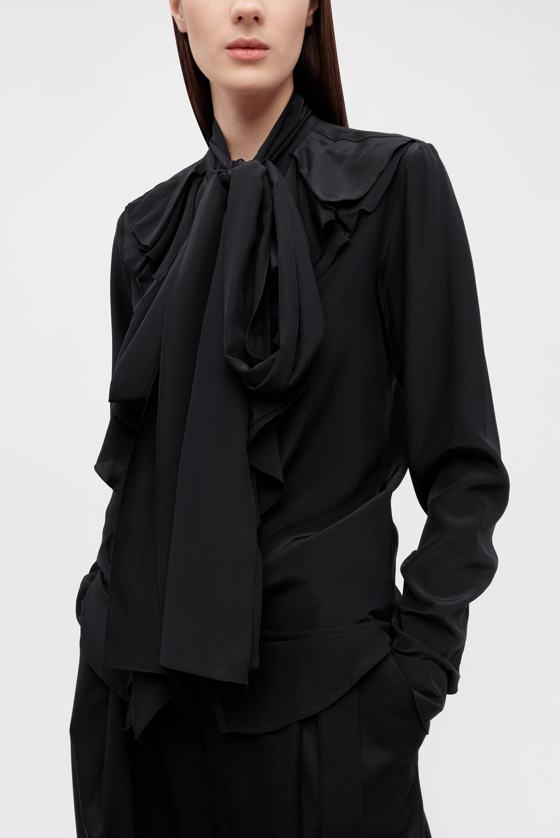 В Leform привезли свежую коллекцию француза Илана Делуа, который совершенно чудесным образом через каждую вещь выражает свой рок-н-ролльный настрой и особые чувства к Средневековью. В подтверждение вышесказанному — черная шелковая блуза с оборками, воротником аскот и объемным бантом (в лучших традициях минувшей Недели мужской моды).