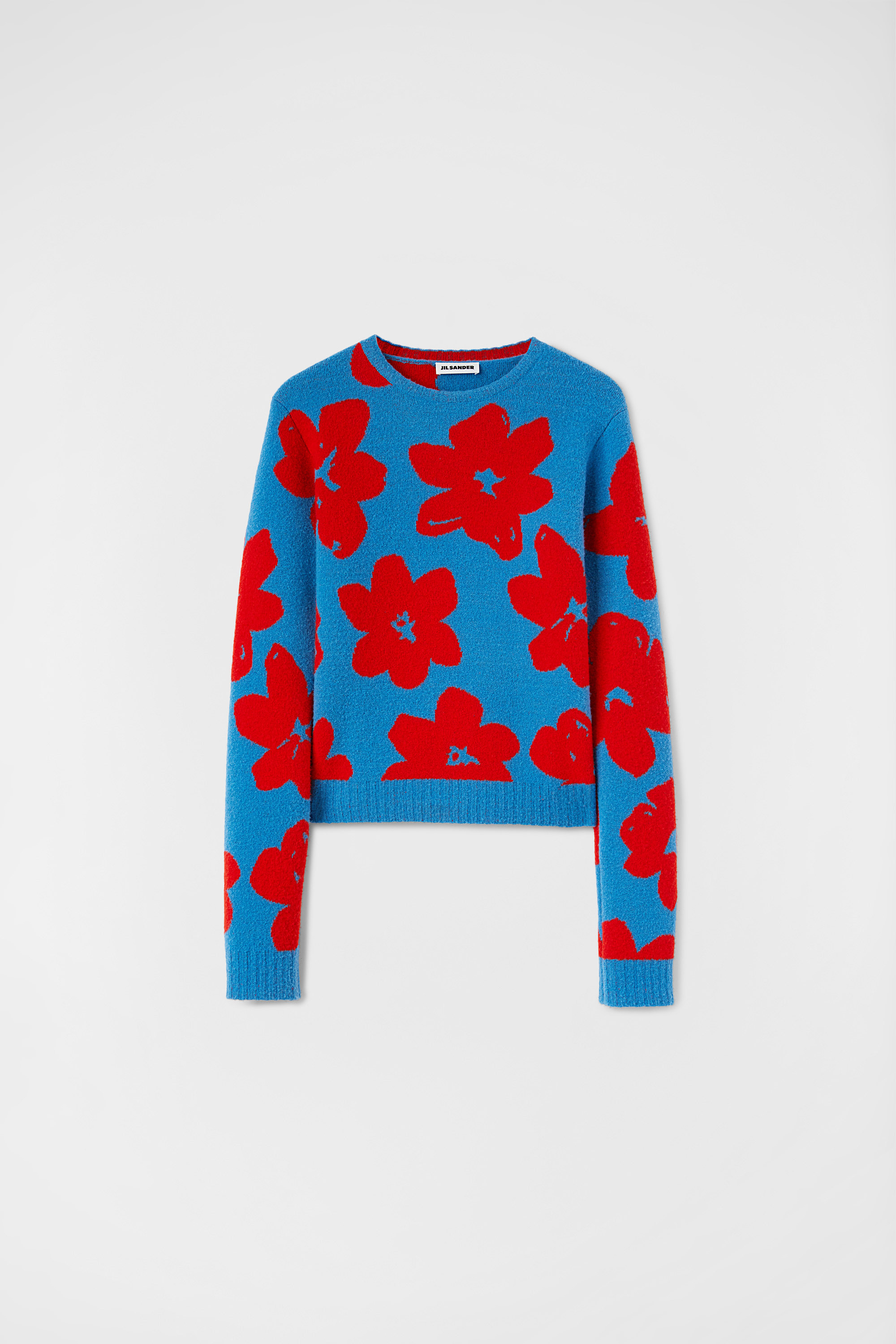 Красные цветки ветреницы (пусть будет она, ведь появляется из-под талого снега одной из первых) распускаются на синем свитере Jil Sander из натуральной шерсти — согревают, успокаивают сердце и радуют глаз.