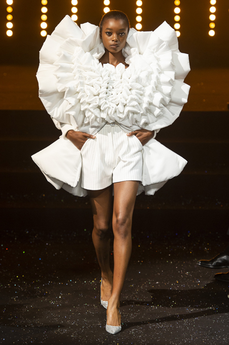 Новой кутюрной коллекцией голландский дуэт Viktor & Rolf отметил четверть века совместной работы. Логично было бы предположить, что в ней Виктор Хорстинг и Рольф Снорен 25 раз (именно столько образов представлено в коллекции) процитируют свои первые творения, но они решили подойти к важной дате иначе. За основу дизайнеры взяли белый как цвет чистого листа и свежего холста. Вокруг него они начали сооружать свои узнаваемые конструкции и создавать декор — например, гигантский пионовидный белый воротник, клепаные лампасы на брюках, оборки из плиссированного тюля, кукольные банты и россыпи из кристаллов Swarovski. Пожалуй, самым запоминающимся стало платье в пол с воздушной шифоновой юбкой, от которой с двух сторон будто откусили по куску, а потом еще и проделали в ней большую сквозную дырку. В общем, Victor & Rolf миновали довольно внушительный временной рубеж, но, определенно, и дальше будут привносить в моду иронию и авангард.
