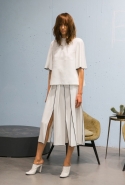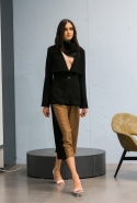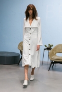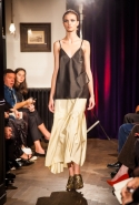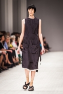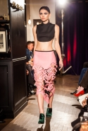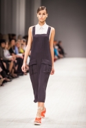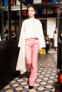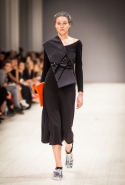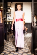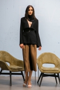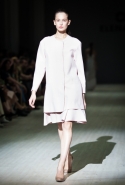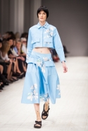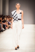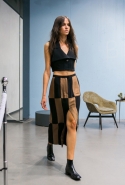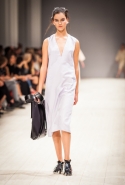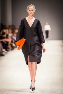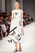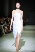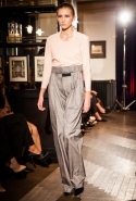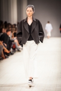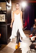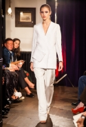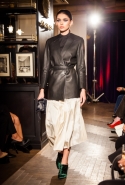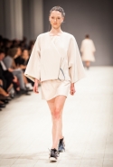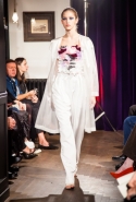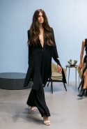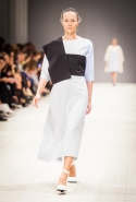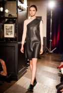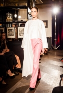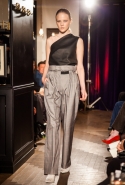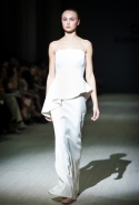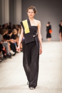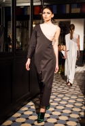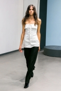Вся коллекция выстроена на контрастах: это и противоречие между цветами и заложенными в них смыслами, и мужского с женским. Глухие жакеты, словно снятые с мужского плеча, и широкие брюки в пол (тоже разрезанные по бокам, словно остро заточенным лезвием) появляются в компании нежных платьев на тонких бретельках. А летящие и развевающиеся полы юбок, порезанные на "хвосты", соседствуют с платьями, собранными из кожаных полос, сшитых друг с другом намертво.