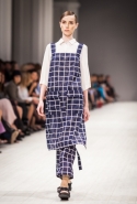 Но в коллекции нет излишней романтичности, присущей многим юным девушкам, готовым, как птички, вот-вот выпорхнуть из родного городка на просторы мегаполиса. Вместо летящих юбок и воздушных платьев Лилия Пустовит предлагает своим клиенткам вещи лаконичного кроя, достаточно простые по силуэтам, но наполненные геометричными деталями. В пересекающих принты логотипах Poustovit, выстроенных по всем законам перспективы и словно убегающих куда-то вдаль, легко читается отсылка к творчеству Эрика Булатова, а рубашки, прямые укороченные жакеты, фартуки и костюмы напоминают рабочую униформу. Во всей коллекции дизайнера, как и в полотнах концептуалиста, сочетаются советский соцреализм с его всегда улыбающимися, как на открытках, рабочими и графика агитационных плакатов, придающая любому изображению двойной смысл.