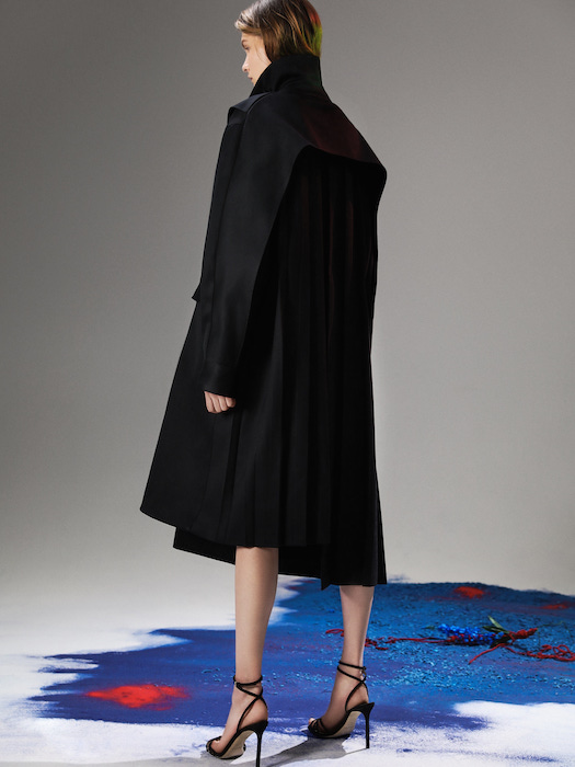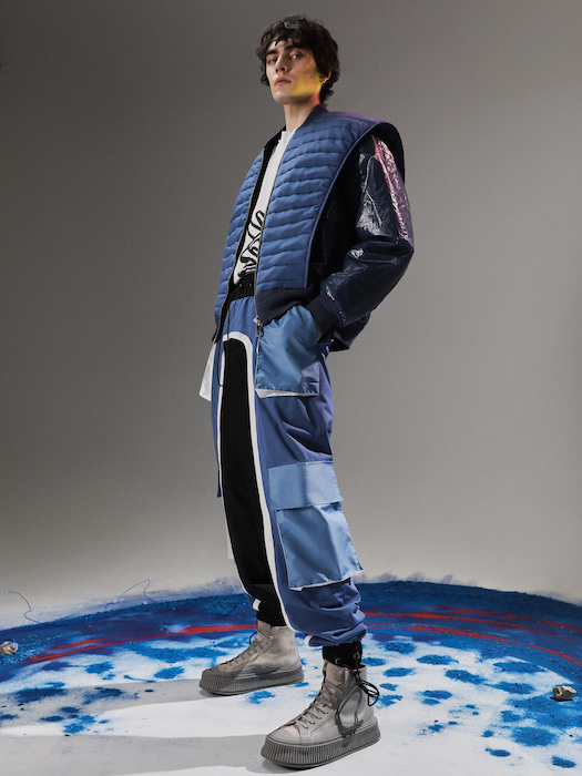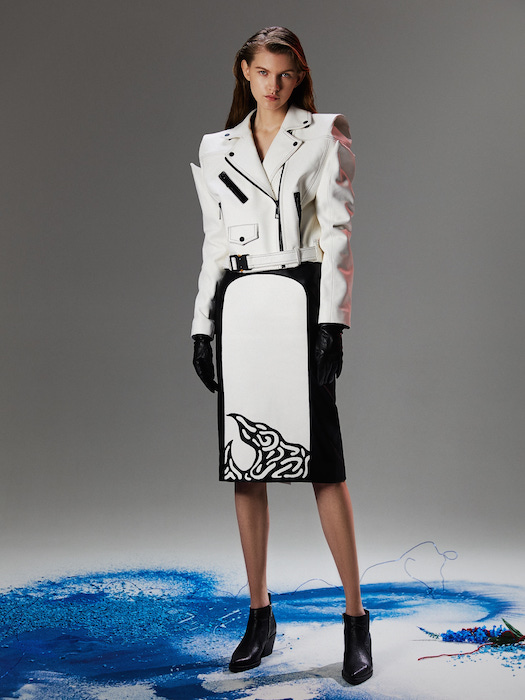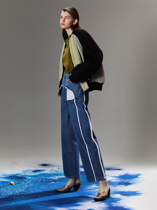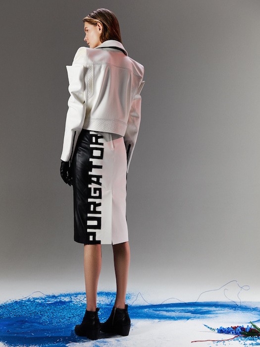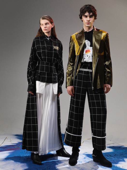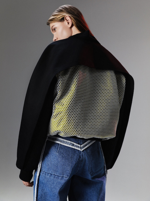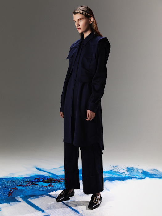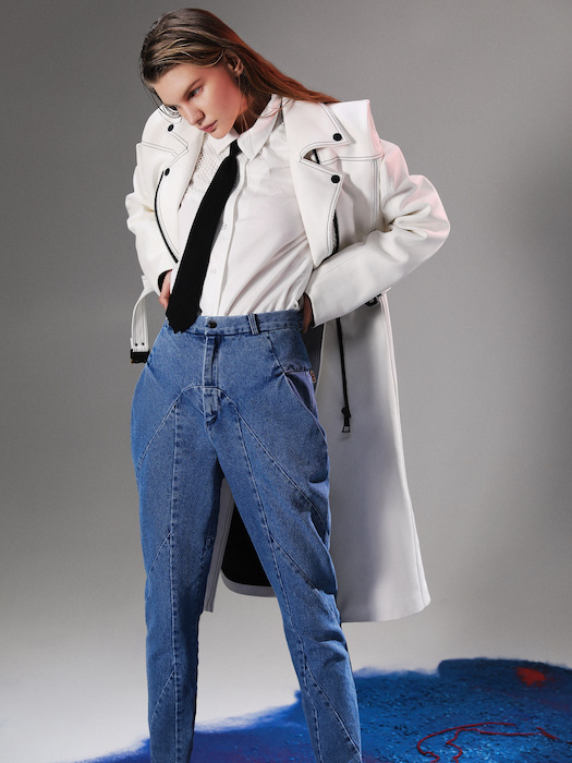 Выпускница Polimoda Ольга Васюкова по первому образованию инженер путей сообщений — этим фактом можно объяснить непростые конструкции конструкции ее вещей: двойные плечи на жакетах, которые меняют очертания силуэта, драпировки на рубашках, сложноскроенные брюки с накладными карманами, джинсовые бомберы-доспехи. В коллекции много кожаных вещей: есть черно-белые юбки-карандаши, пиджаки и куртки с акцентированной линией плеча.