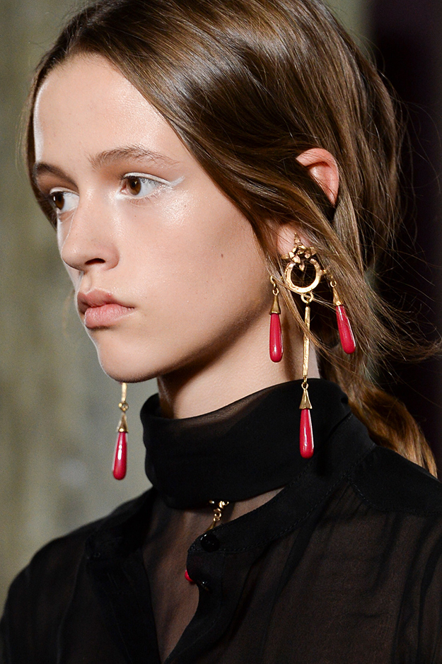 Прически и макияж: собранные волосы, прямой пробор, серебристый макияж глаз.